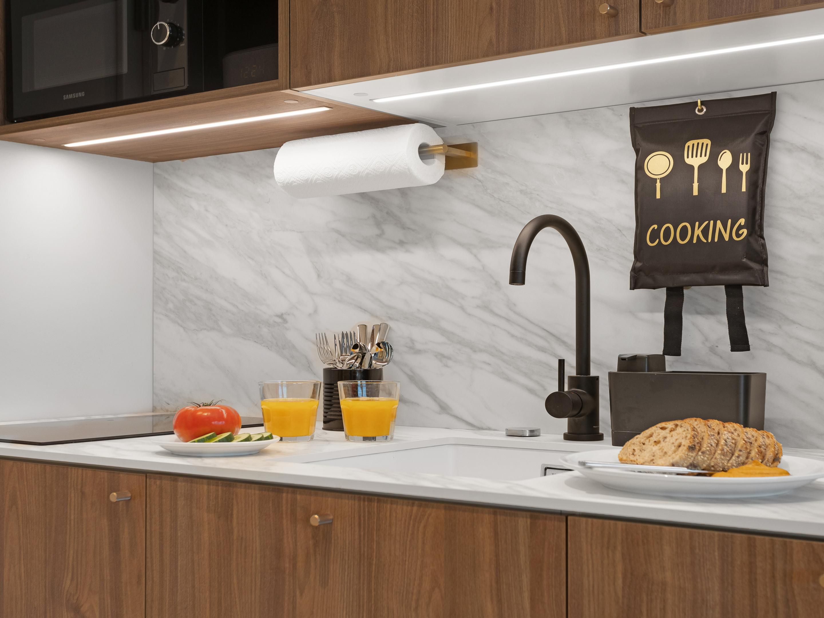 Each of our 53 spacious apartments features a fully equipped kitchen with a refrigerator, dishwasher, microwave, kitchen hob, and coffee pod machine — perfect for preparing your own meals at any time. Iron, Ironing board or steamer are available upon request for your convenience.
