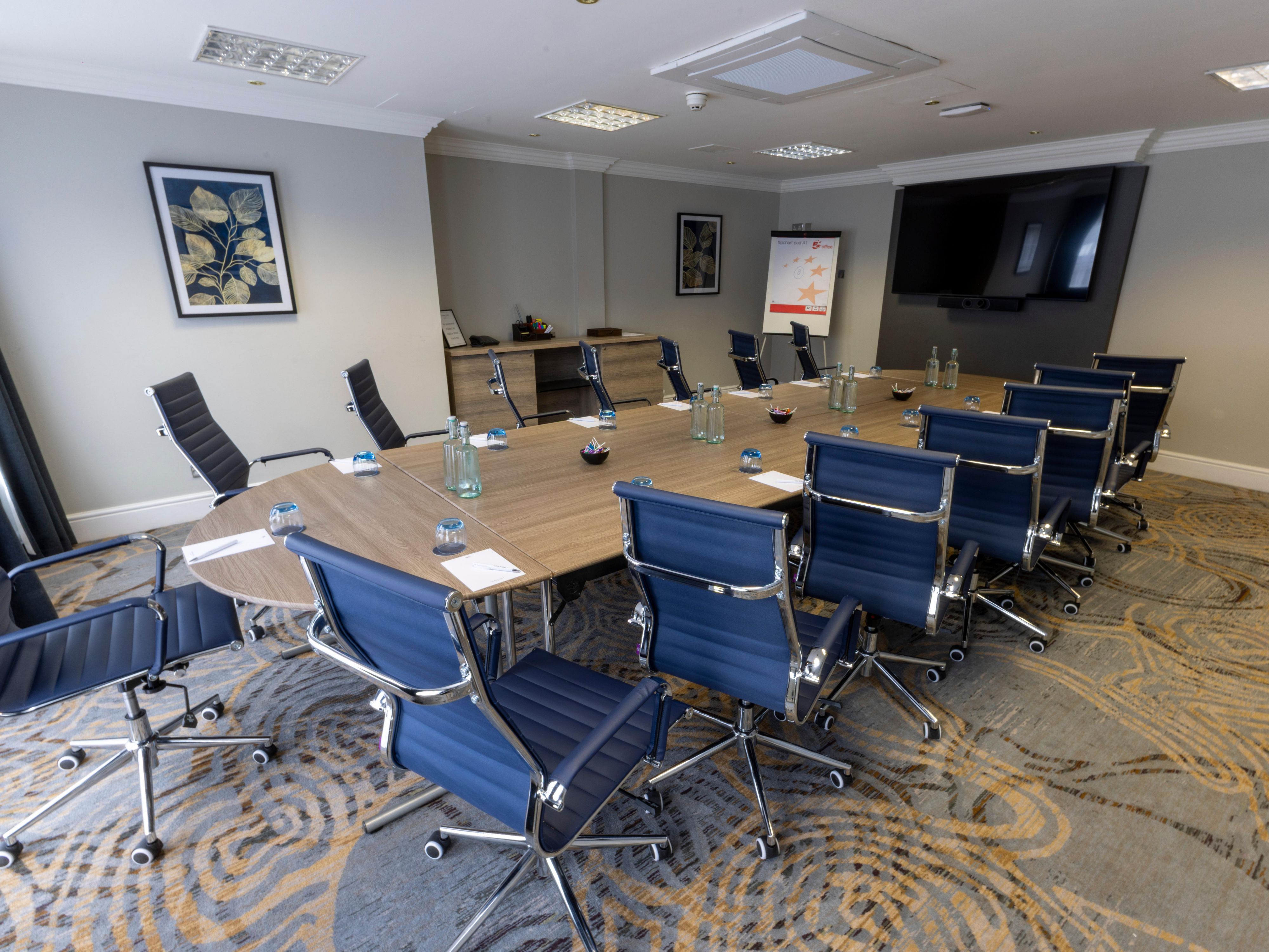 غرفة اجتماعات مرنة بإضاءة طبيعية ومجهزة بالكامل بنظام الراحة الهوائية وعروض الصوت والصورة الحديثة وشاشة تلفزيون بلازما 65 ". مساحة الاجتماعات المثالية لما يصل إلى 10 - 14 مندوب.