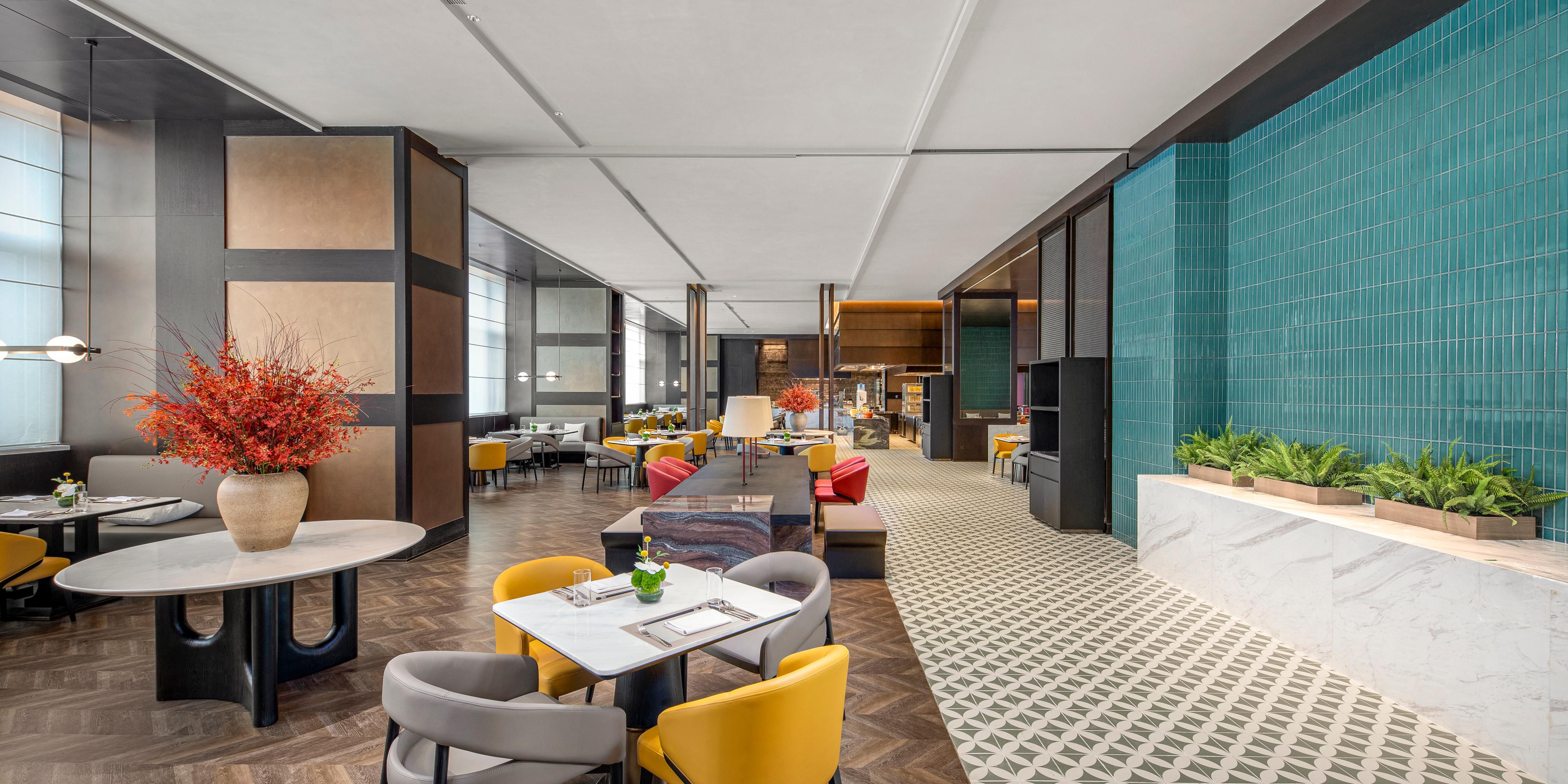 京·彩cafe全日制餐厅位于酒店三层,主题为“南街寻味”,可同时容纳176人就餐。户外外摆区还可为40位客人提供服务。室内设计延续新中式风格,通过苍绿与玄黄的碰撞,以及在层架上摆设的跟食物相关的艺术品摆件,营造出市集琳琅和欢乐。