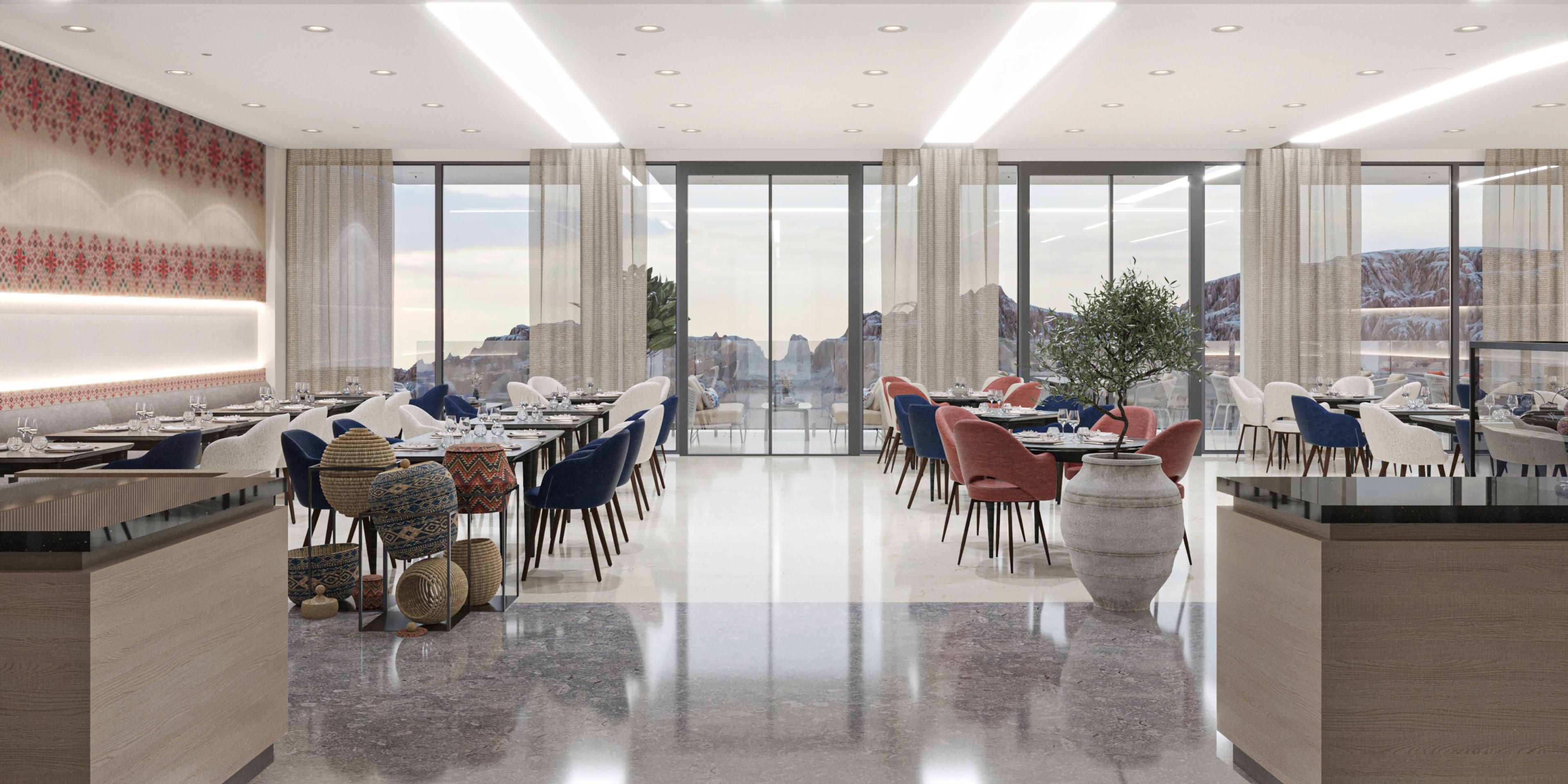Conveniently located at the heart of the lobby, our bar offers a tempting array of food and beverages, from Mediterranean dishes and snack bar options to refreshing signature cocktails. Take in breathtaking views of the Petra Mountains, creating the perfect setting to relax.