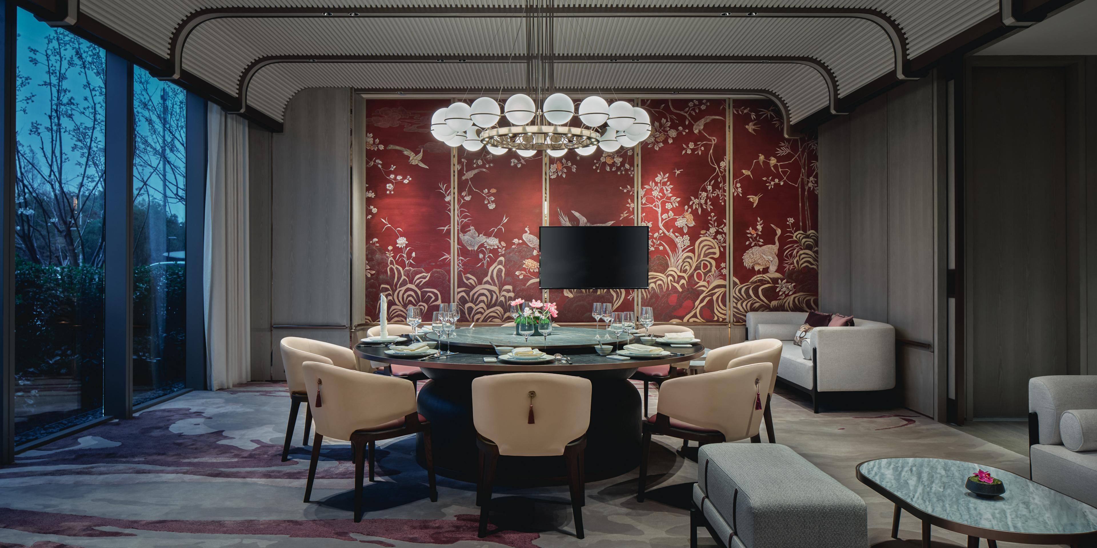 Caifenglou Restaurant is located on the first floor of the hotel, with the design concept of mountain view, jade ball, golden phoenix decoration. There are 120 seats in total, 40 seats in the hall, 80 seats in six PDRs, which named after Chinese birds, including Zhuque, Bailing, Bailu, Honghu, Xiangsi, Yuyan. Mainly provides Hangzhou cuisine and Cantonese cuisine, as well as traditional Chinese specialty dishes.