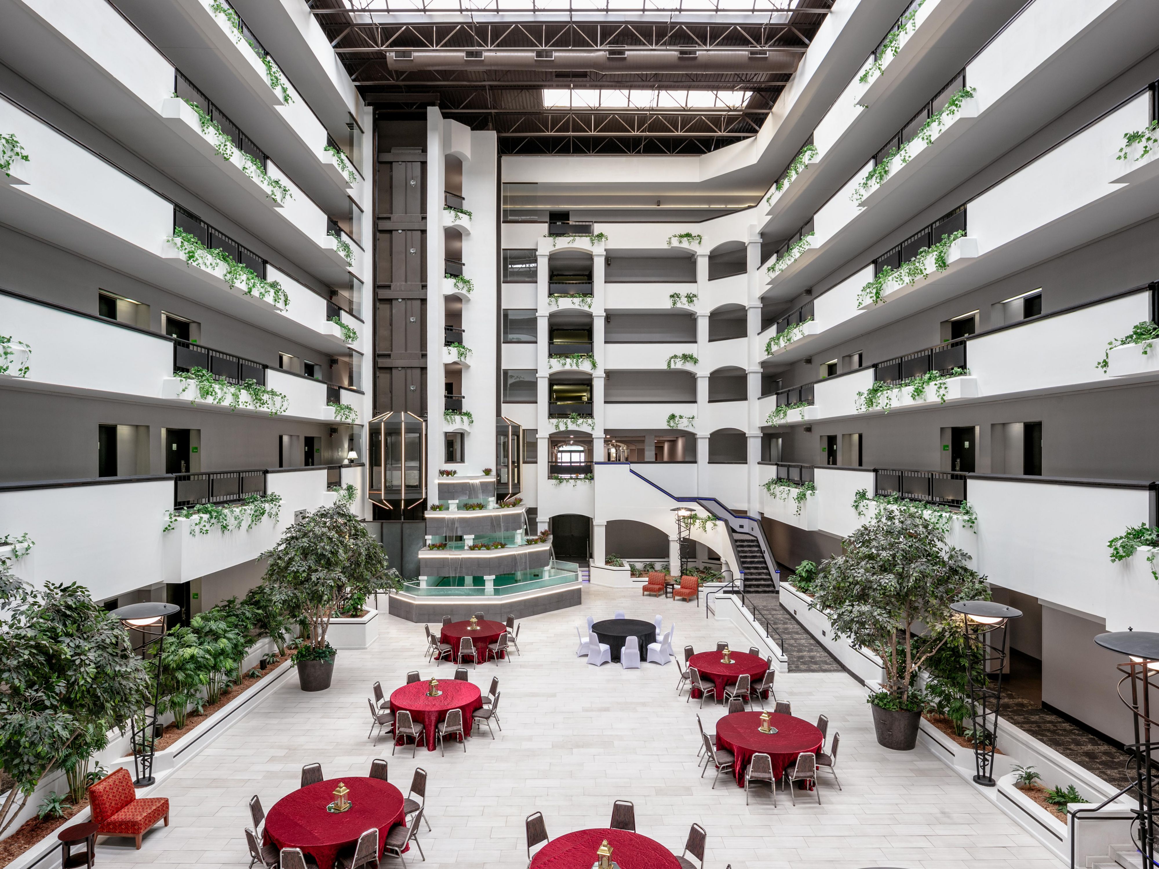 El Atrium ofrece un espacio versátil con capacidad para alojar hasta 220 huéspedes, perfecto para reuniones de negocios, conferencias y reuniones sociales. Esta habitación cuenta con iluminación natural, tecnología audiovisual y disposición flexible de los asientos.