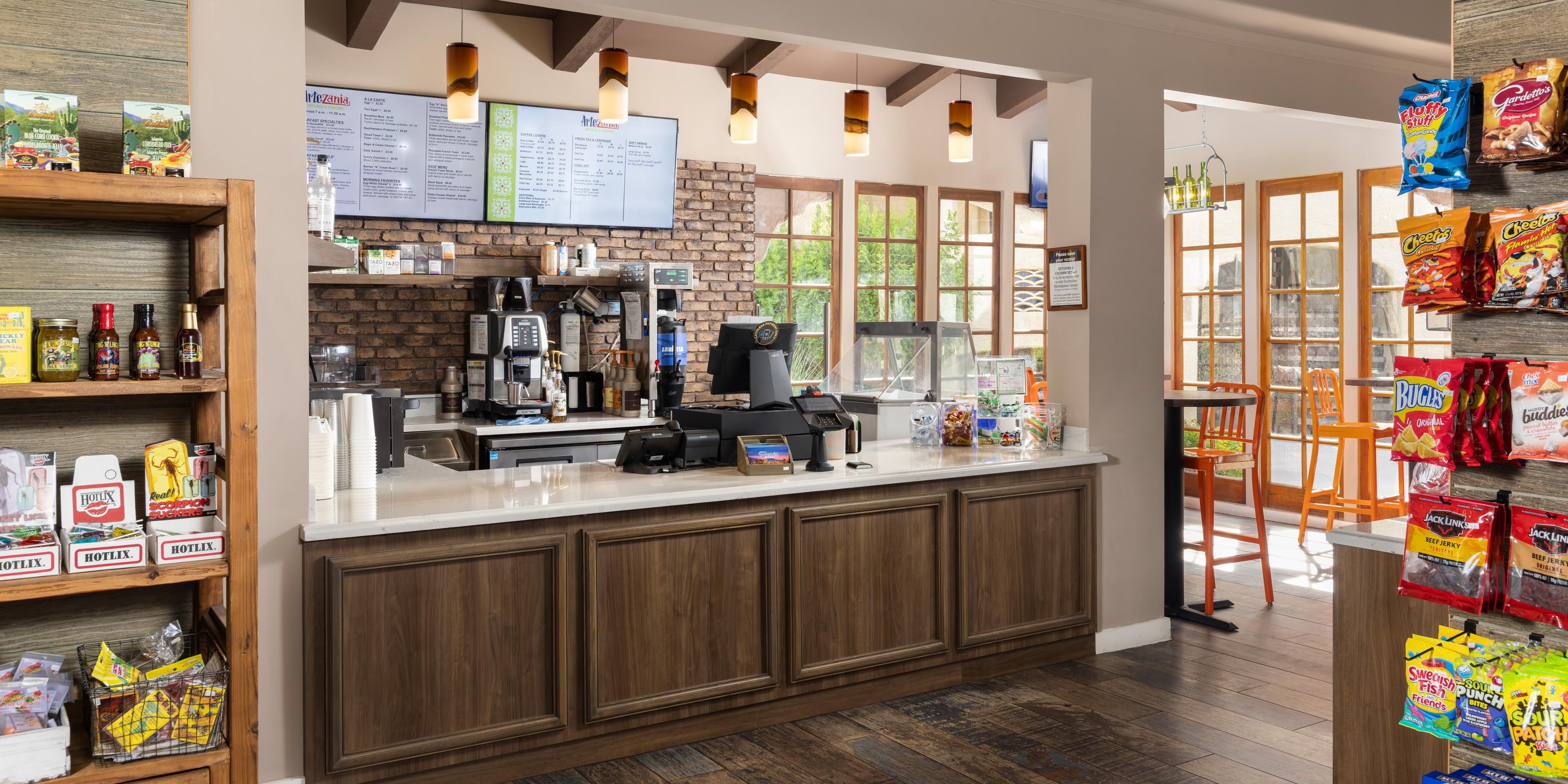 Scottsdale Resort cuenta con un delicioso restaurante de servicio completo inspirado en el suroeste, además de Marketplace donde puede tomar el desayuno y comprar alimentos para abastecer su villa.