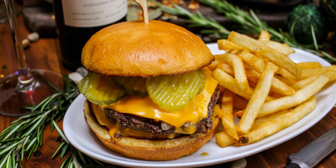 hamburguesa doble, queso cheddar, cebolla, pepinillos, lechuga, pan brioche