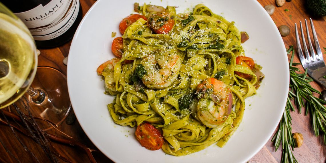 orzo con pesto y pimientos rojos, salsa de mantequilla de ajo y limón