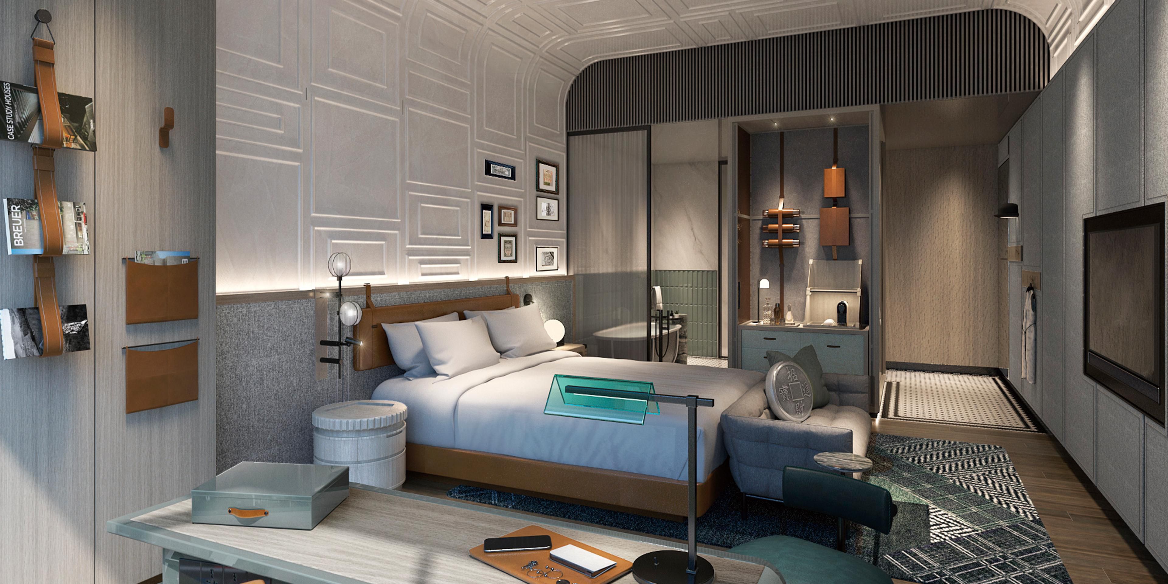Hotel Indigo Ningbo takes the century-old legend of Yong merchants as its narrative thread, drawing inspiration from the historic character of Ningbo’s old money houses and Jiangxia Street. Symbols of the Ningbo Merchant Group such as scales, abacuses, Chinese silver dollars, accounting rooms and old shop signs are reinterpreted with a contemporary touch. These elements are woven into every corner of the hotel, from guest rooms to restaurants, from the bar to meeting spaces.