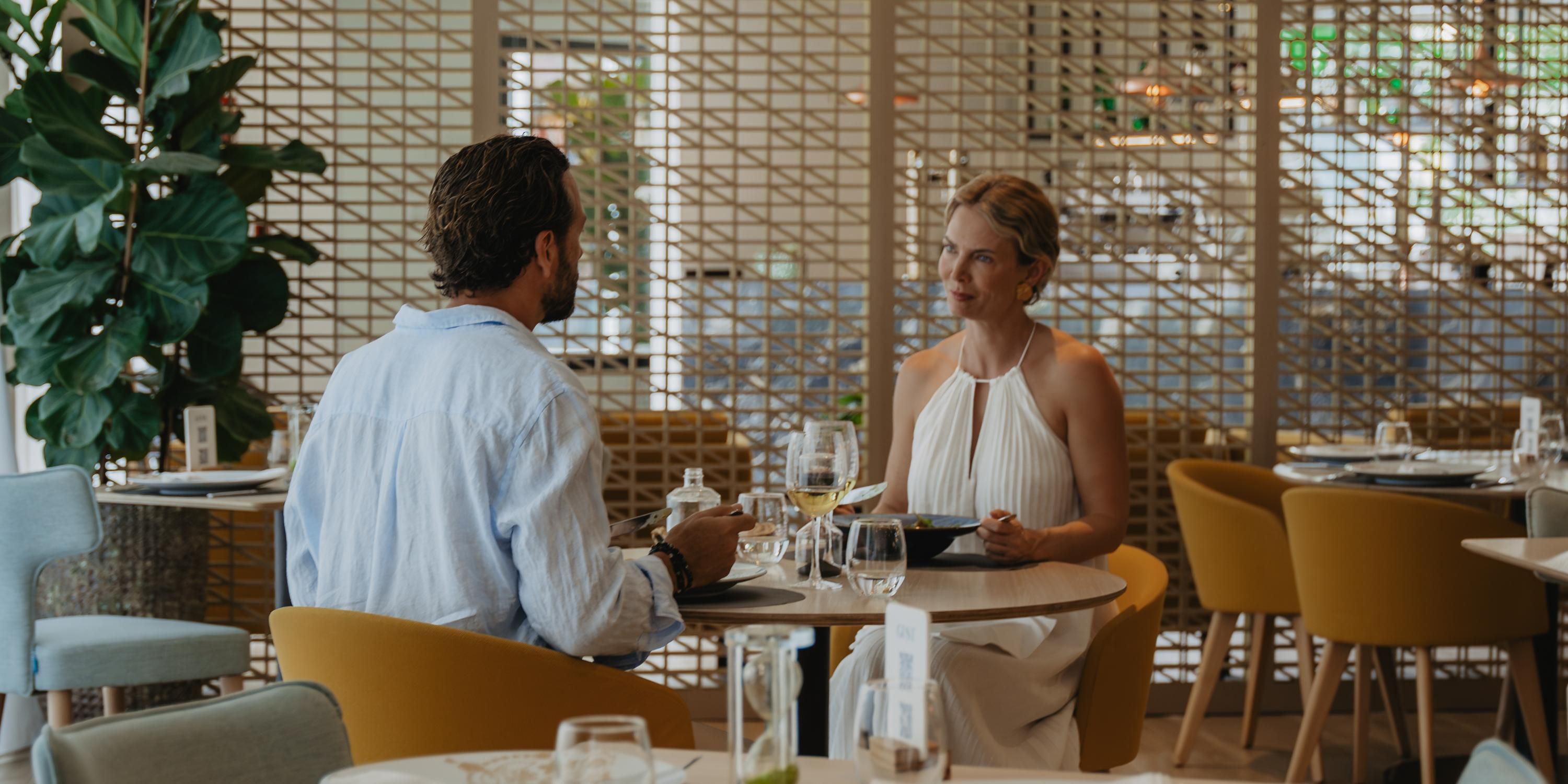 En el restaurante Dunas te espera una experiencia culinaria variada: ensaladas frescas, arroces, especialidades italianas, pescados y carnes a la parrilla. Déjate llevar por las creaciones de nuestros chefs y las vistas al mar, en un entorno sereno acompañado de música chill out.