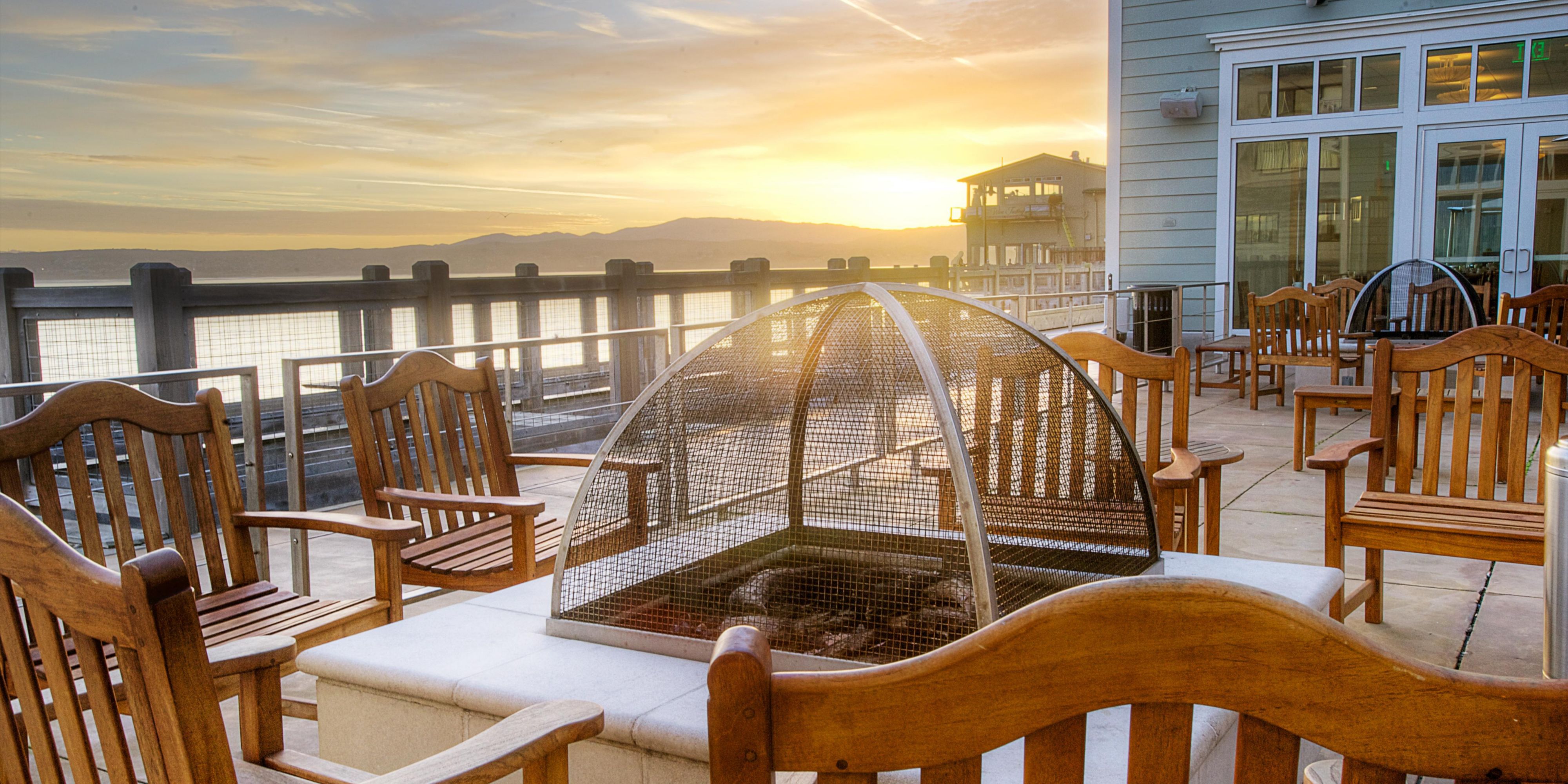 O espaço ao ar livre flexível na orla de Monterey Bay apresenta dois poços de fogo estacionários e os locais e tons da Baía de Monterey. Os aprimoramentos incluem móveis de teca, lâmpadas de aquecimento e iluminação aérea do mercado.