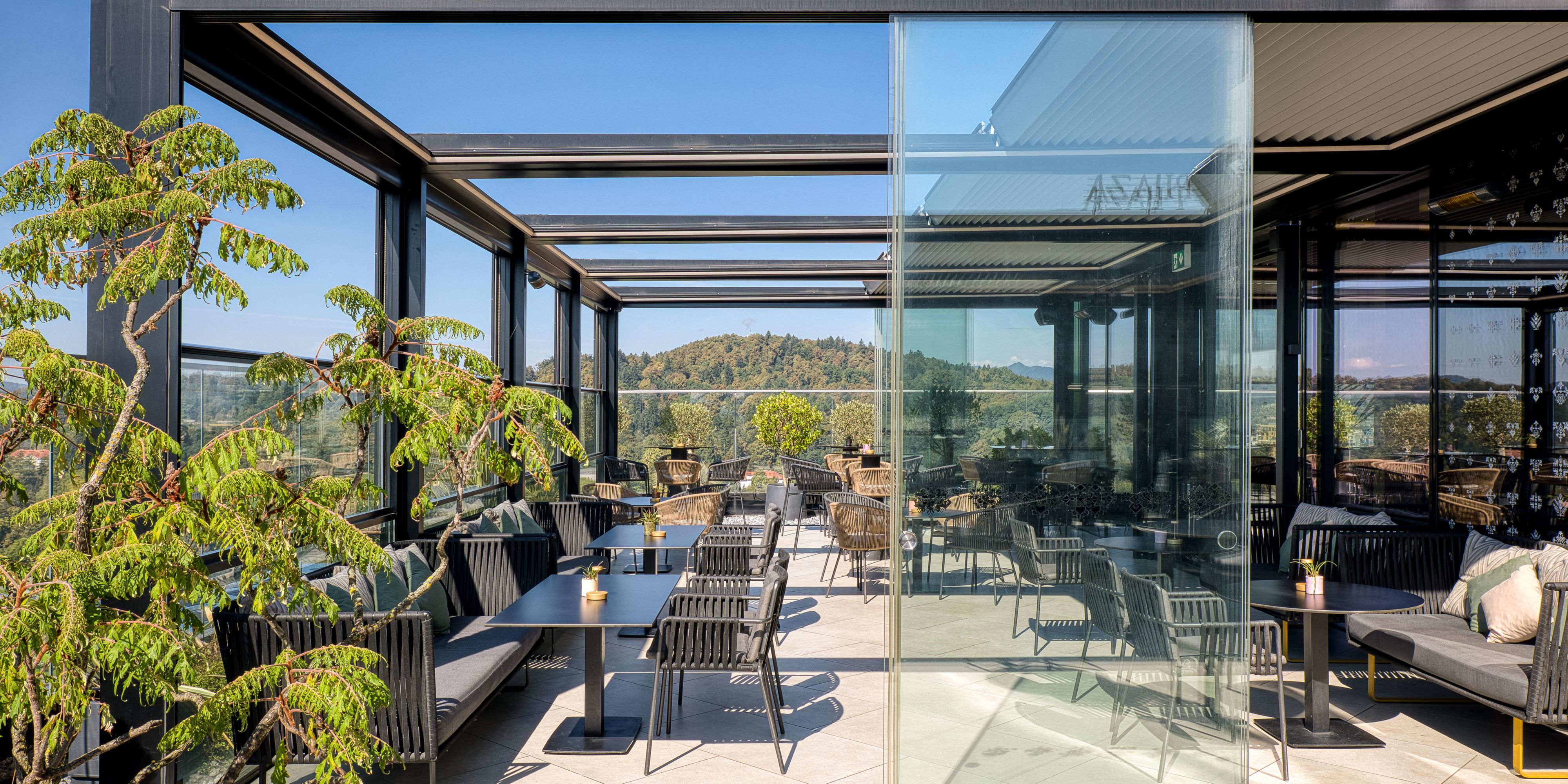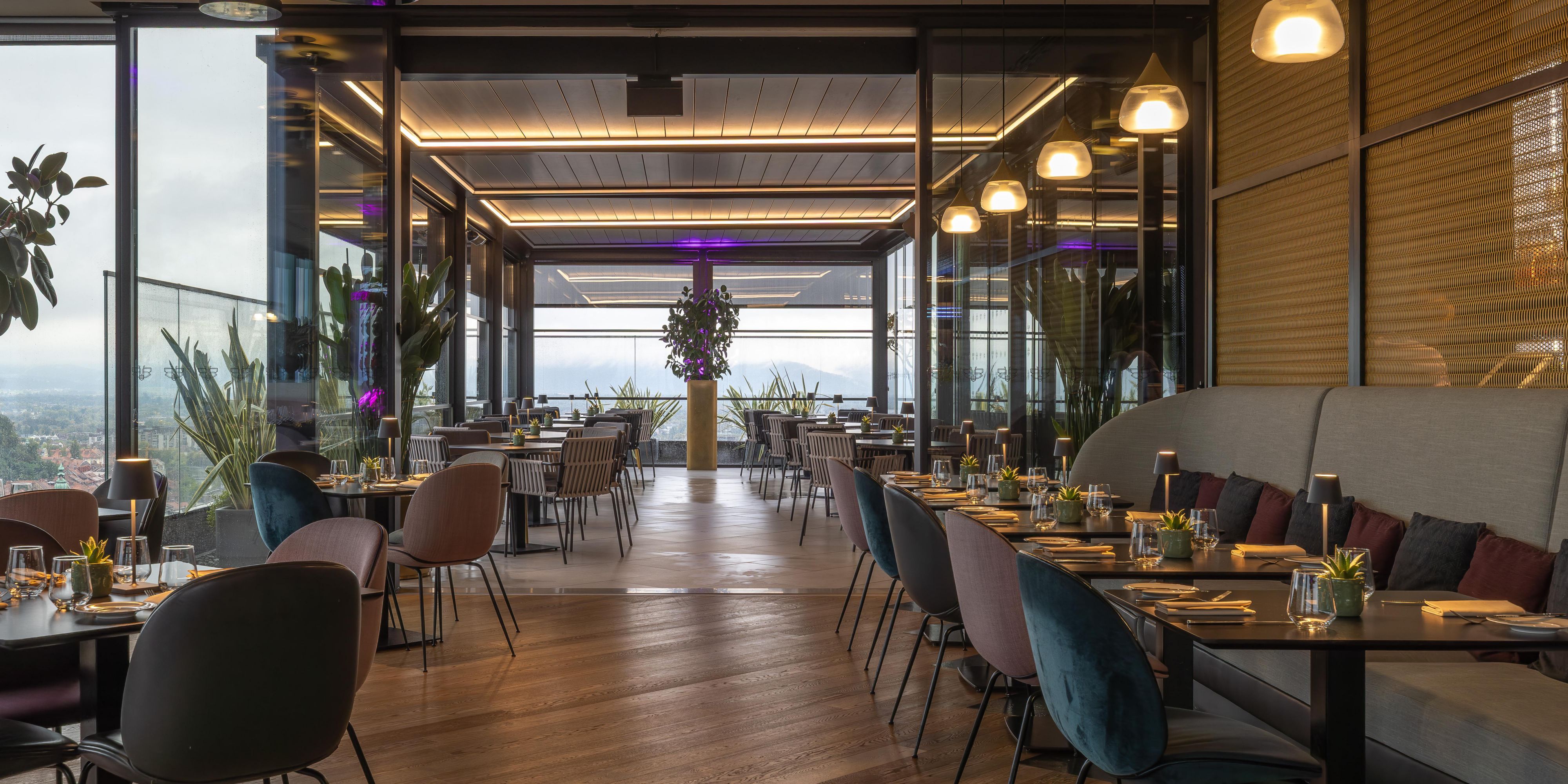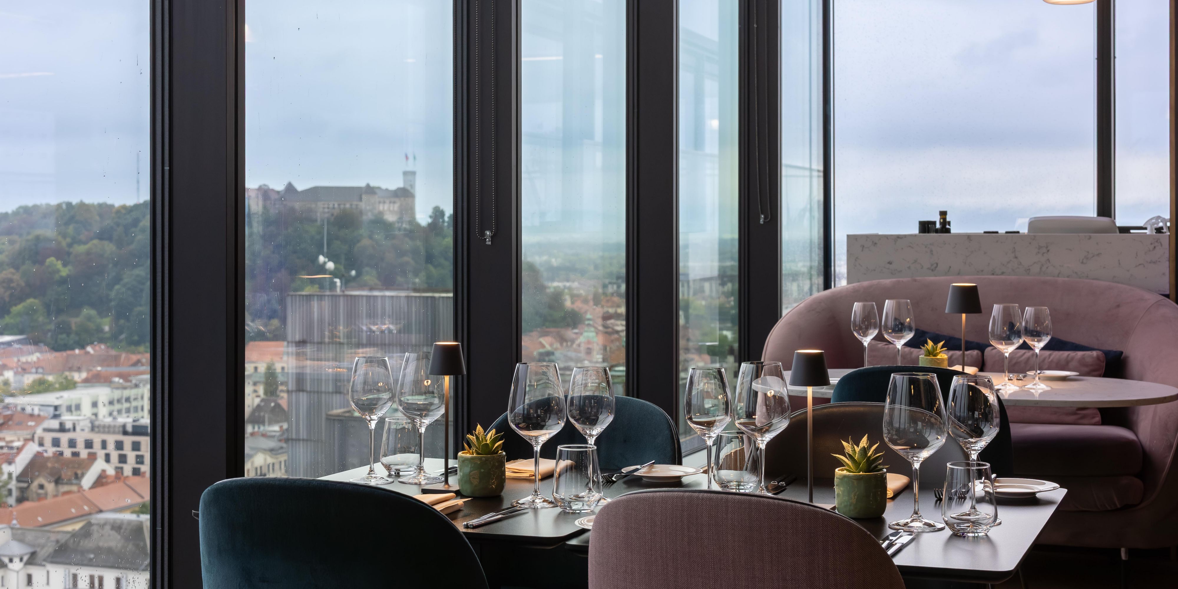 Unser von Michelin empfohlenes Dachrestaurant bietet durch seine raumhohen Fenster atemberaubende Ausblicke. Das moderne Design und die offene Küche bieten einen idealen Rahmen, um neben Slowenien-Spezialitäten elegante, zugängliche internationale Gerichte zu genießen.