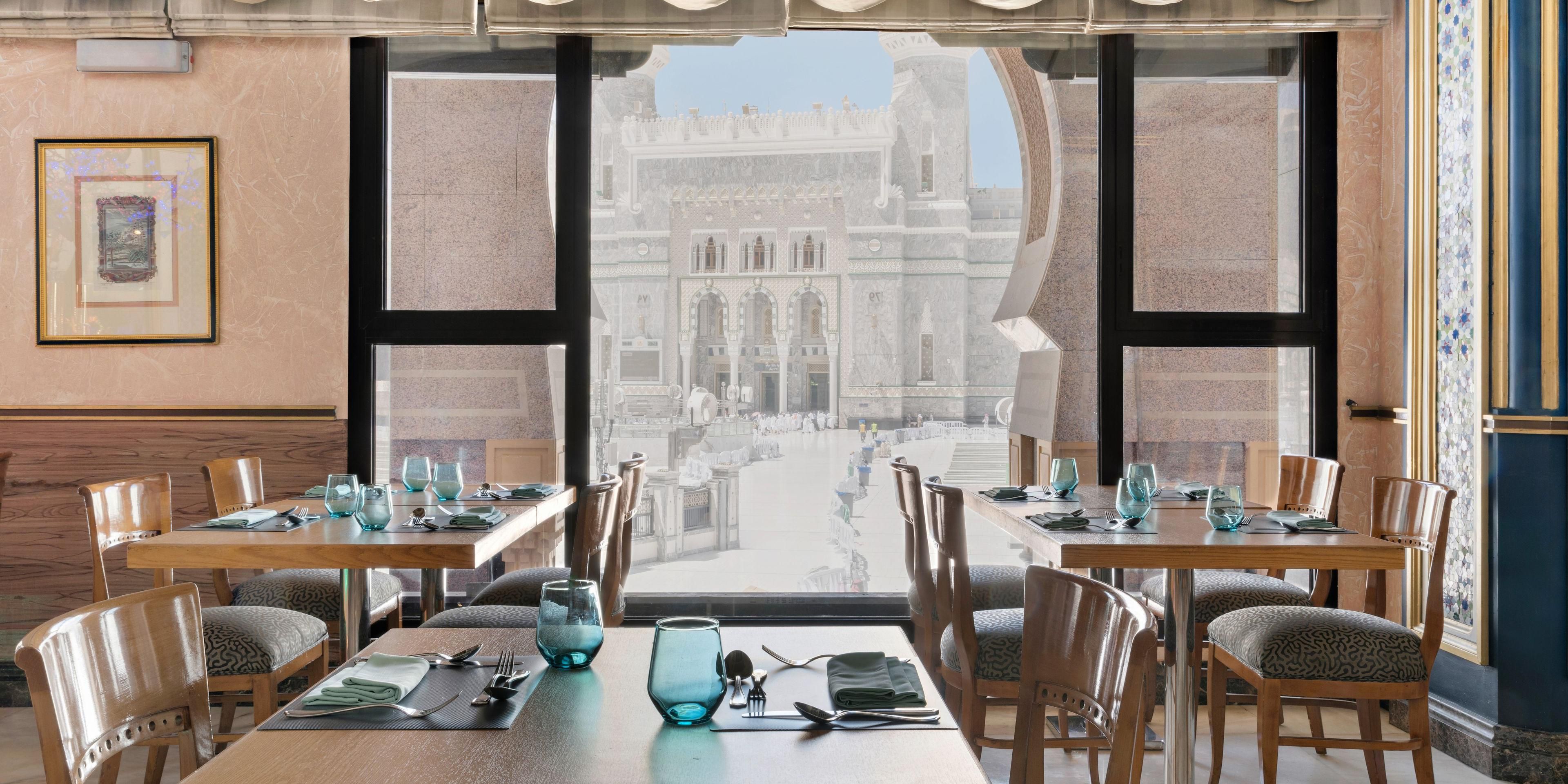 Succumb to a symphony of flavours at Al Tayebat Restaurant, where you can enjoy a sumptuous buffet breakfast within a refined dining room gleaming with gold accents, marble floors and stunning views of the Holy Mosque. At peak periods, we also offer a delicious international lunch and dinner buffet.