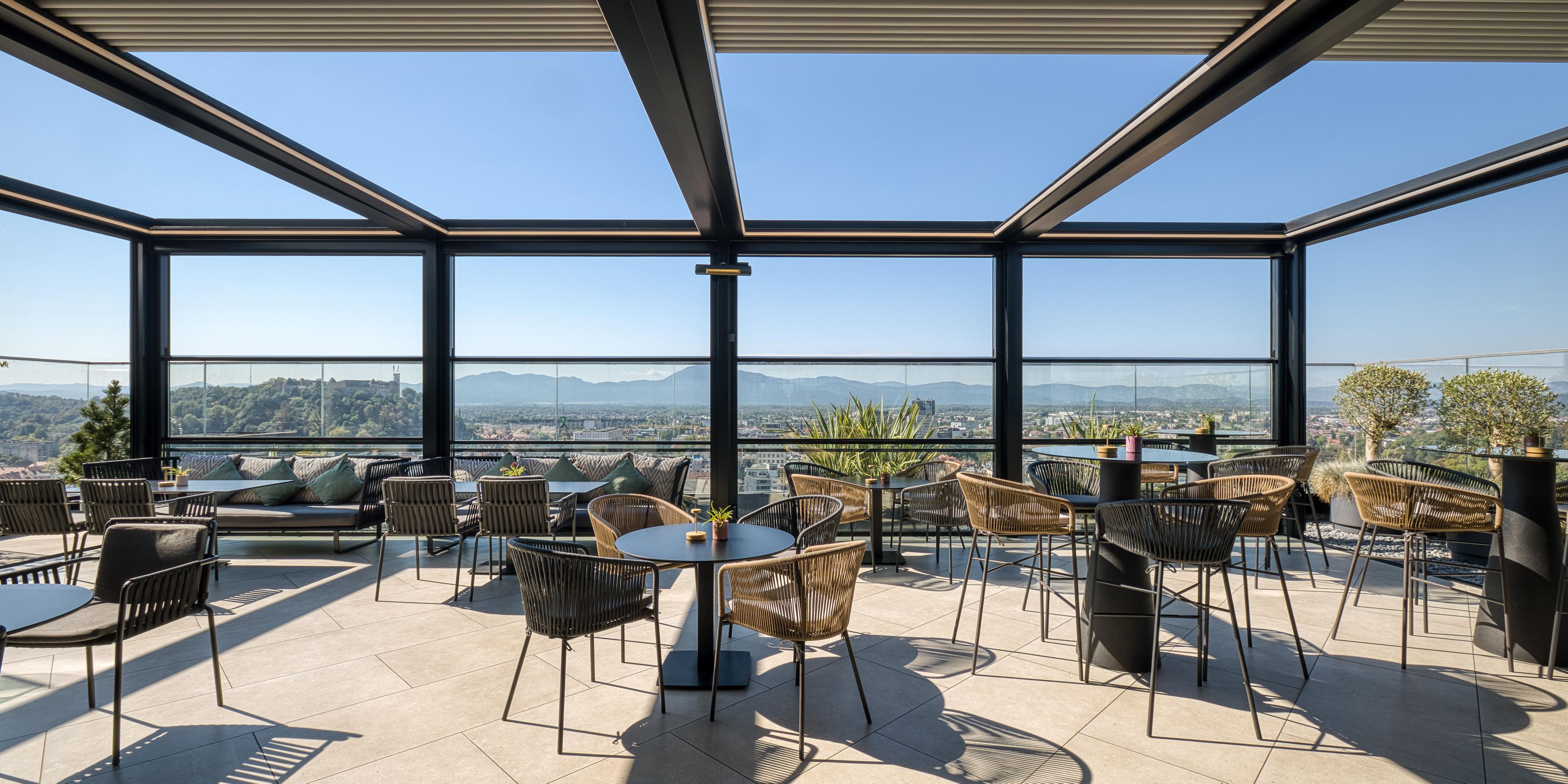 Restoran atap kami yang direkomendasikan Michelin menawarkan pemandangan yang menakjubkan melalui jendela dari lantai ke langit-langitnya. Desain kontemporer dan dapur terbuka menyediakan pengaturan yang ideal untuk menikmati hidangan internasional yang elegan dan mudah didekati bersama dengan spesialisasi Slovenia.