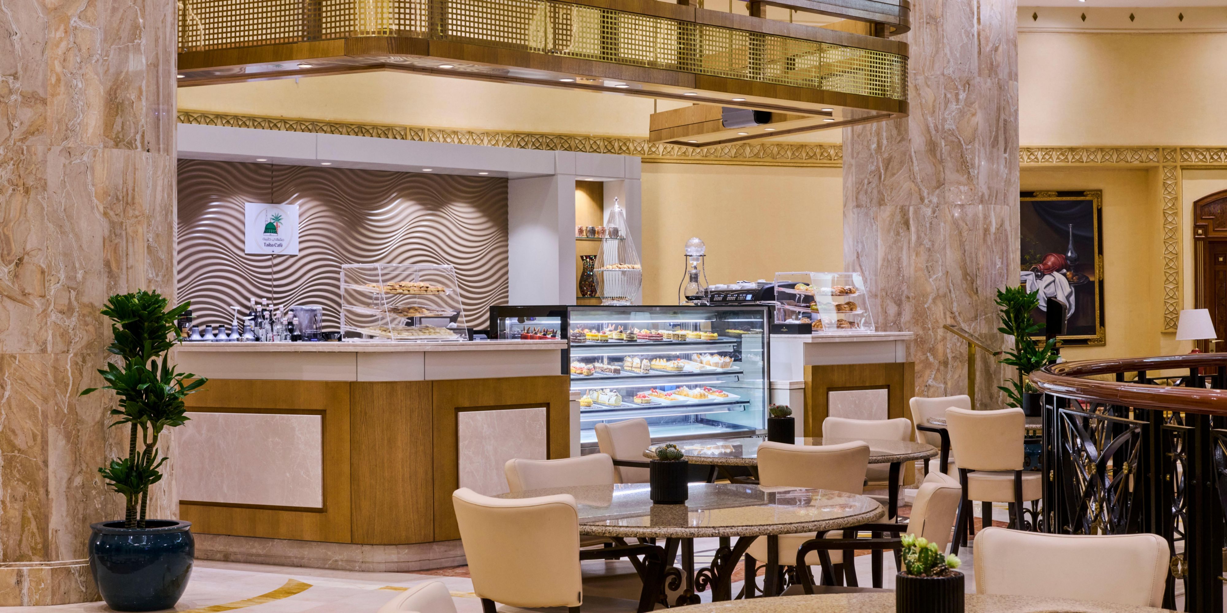 Il Taiba Café dell'InterContinental Dar Al Iman, situato in posizione ideale vicino a Haram ea pochi minuti dall'ingresso delle donne alla Santa Moschea, offre uno spazio delizioso per rilassarsi da soli o con gli amici. Assapora una vasta gamma di snack, hamburger, pizze e molto altro in questo invitante rifugio.
