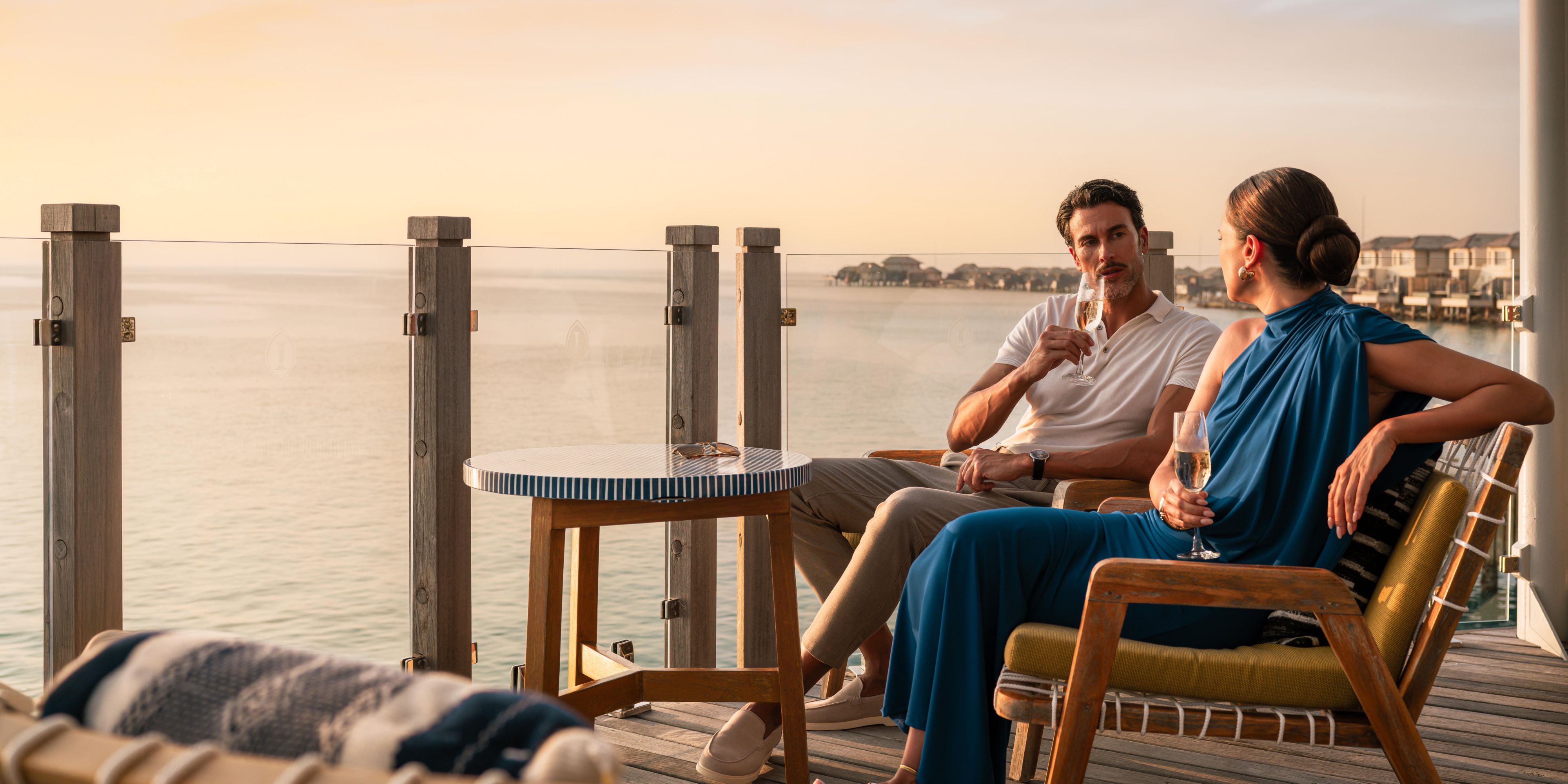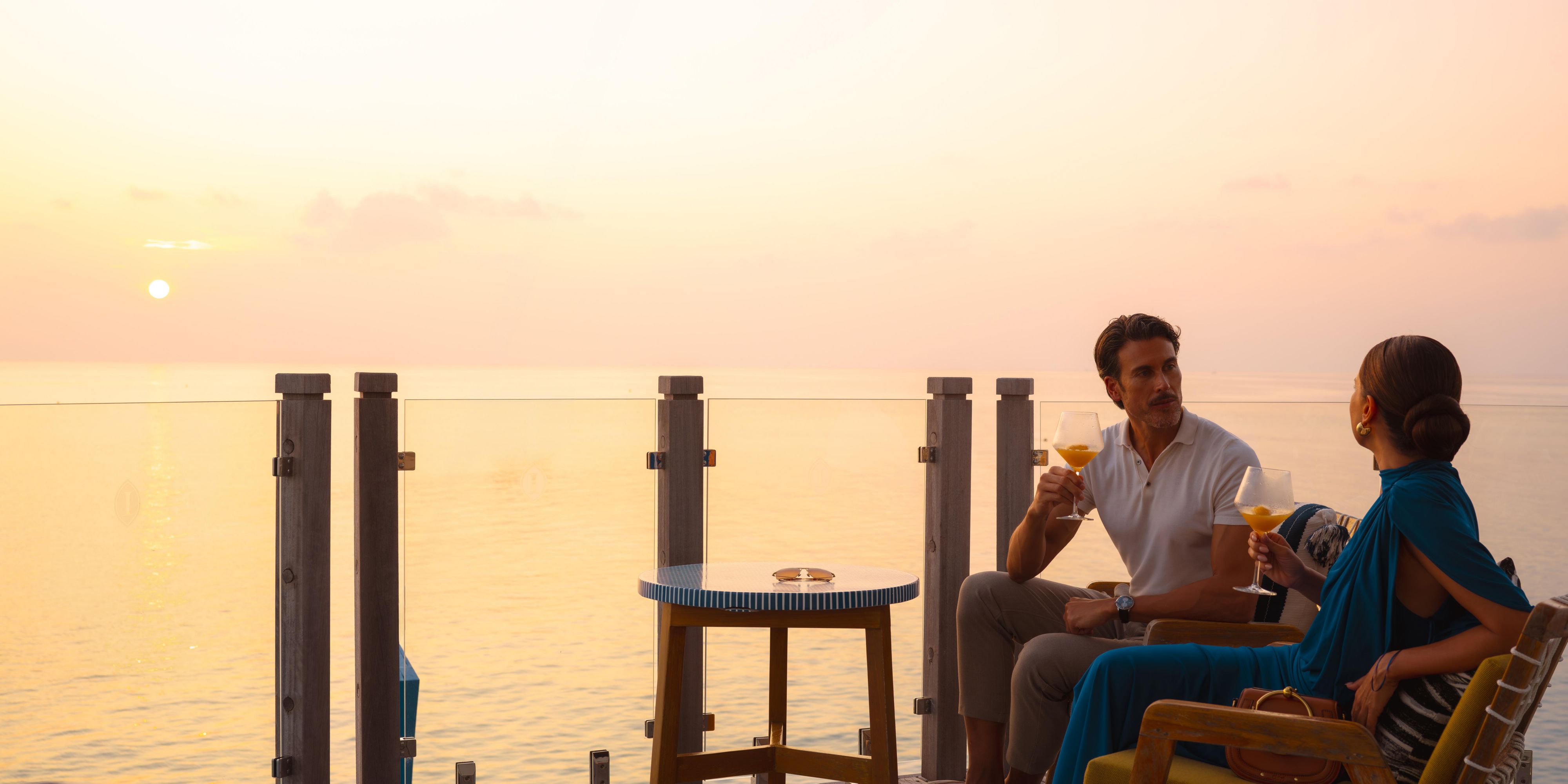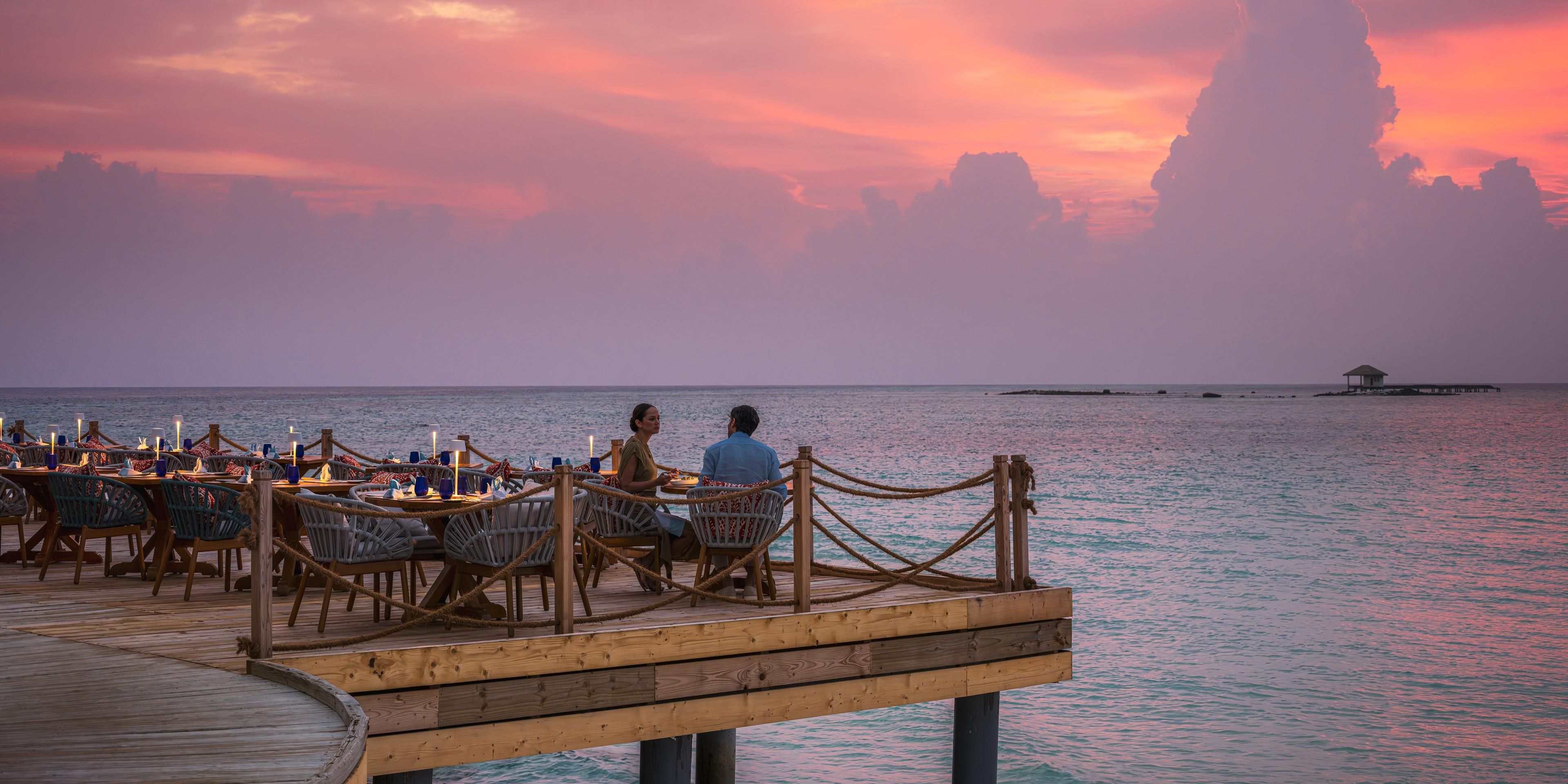 Saboree cócteles de champán con esferas heladas infusionadas mientras disfruta de las fascinantes vistas del atardecer desde el timón de nuestro bar en forma de dhoni. Nuestros cócteles exclusivos, las recomendaciones expertas de Champagne Sommelier y los deliciosos canapés complementan el ambiente íntimo, todo mejorado con música seleccionada.