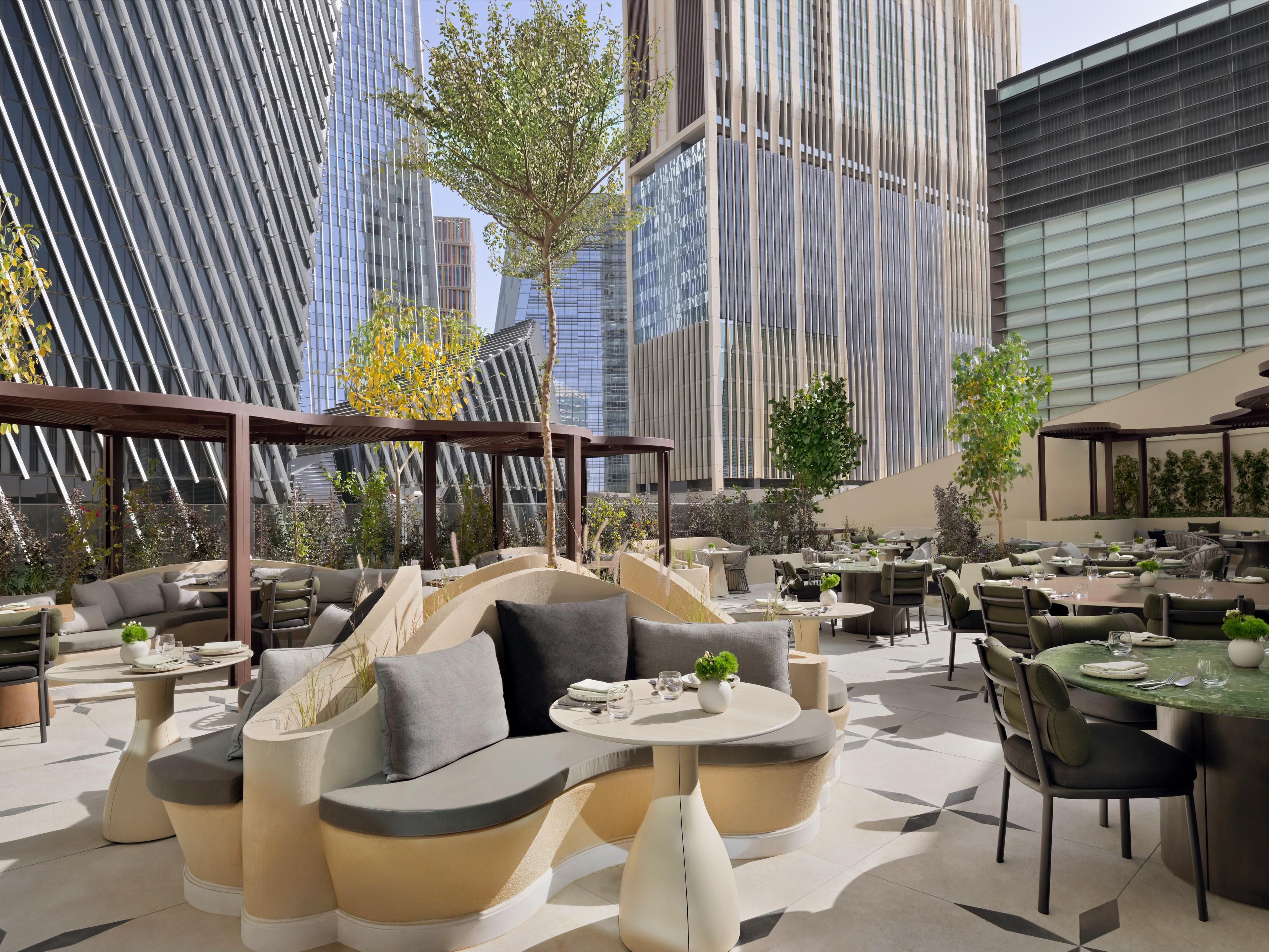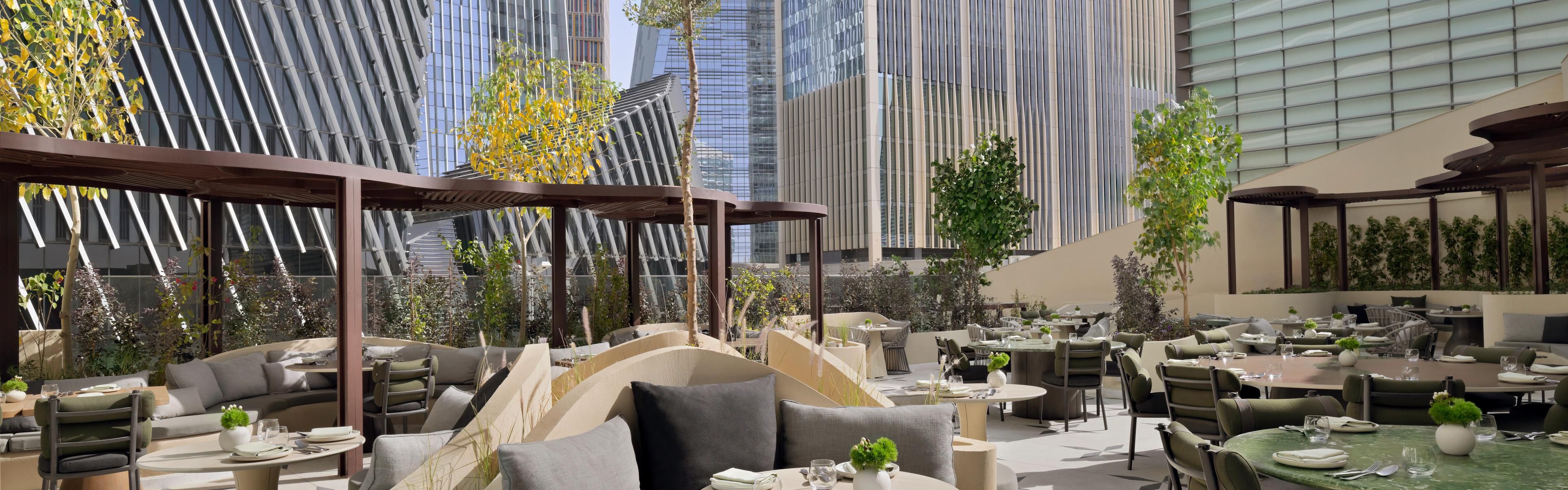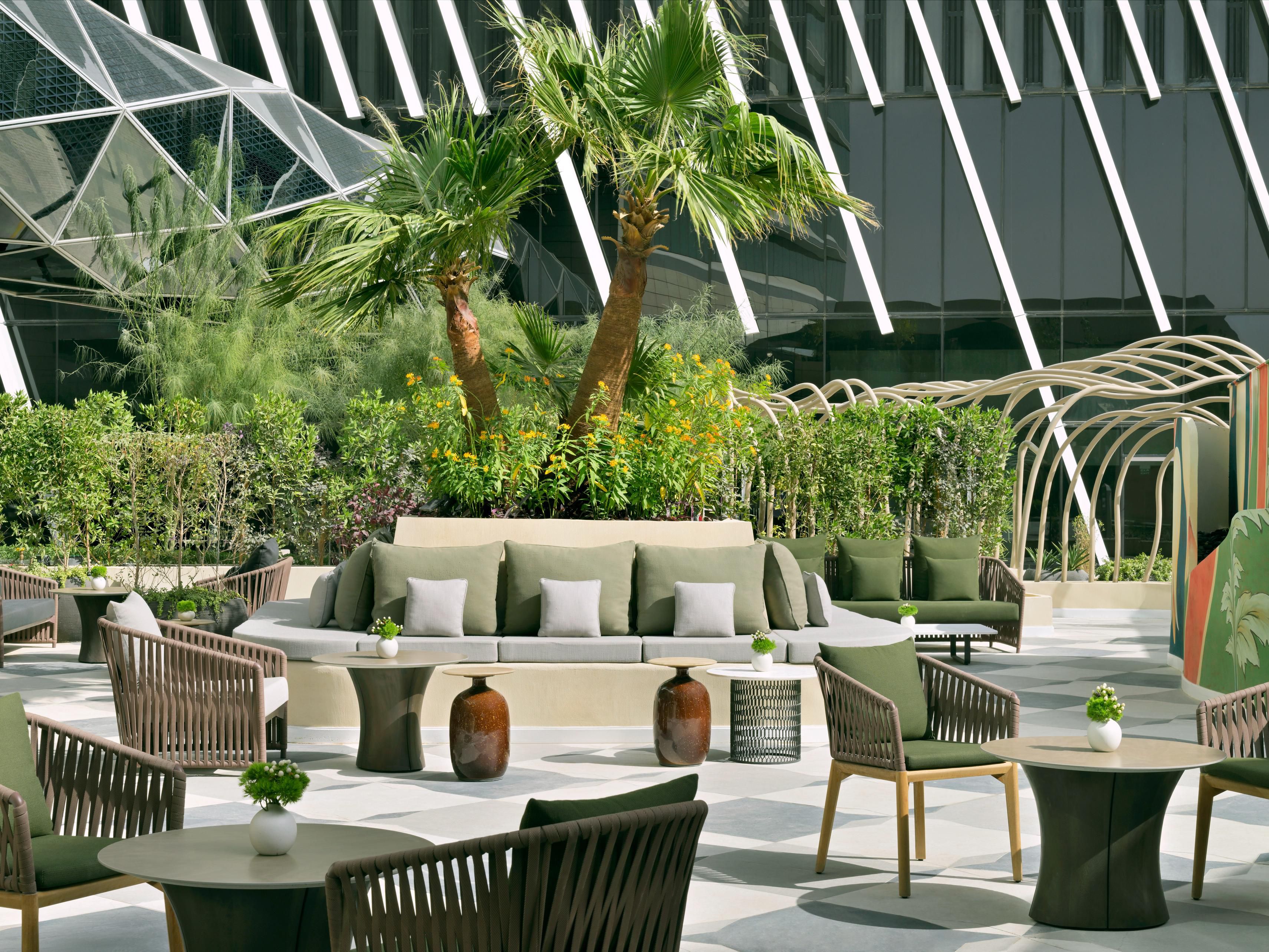 Ziya, lounge lobi kami, tempat seni Riyadh bertemu dengan kue-kue yang ditinggikan, sandwich artisanal, dan minuman botani di ruang yang canggih dan mengundang