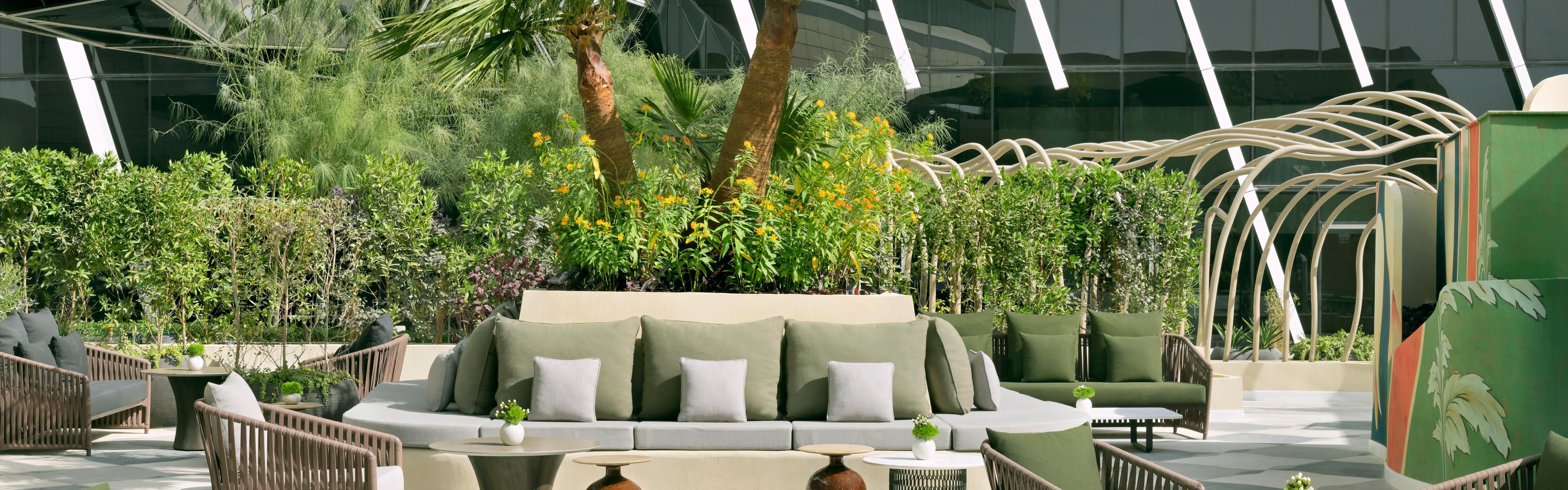 Ziya, lounge lobi kami, tempat seni Riyadh bertemu dengan kue-kue yang ditinggikan, sandwich artisanal, dan minuman botani di ruang yang canggih dan mengundang