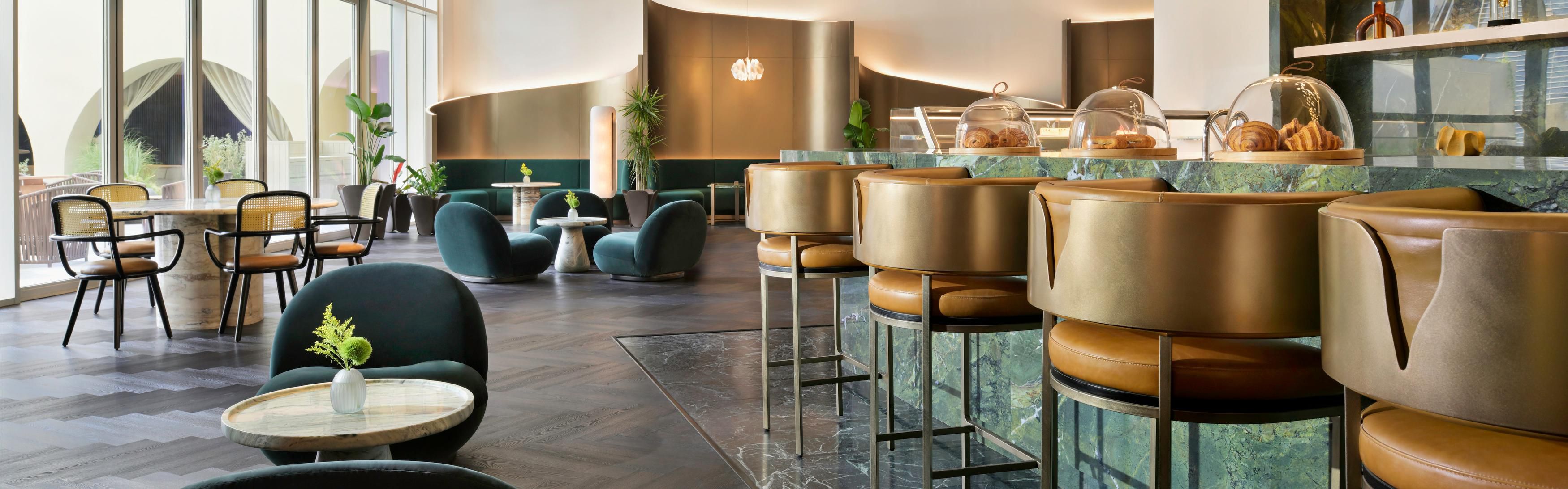 Ziya, la nostra lobby lounge, dove l'arte di Riyadh incontra dolci, panini artigianali e bevande botaniche in uno spazio sofisticato e invitante