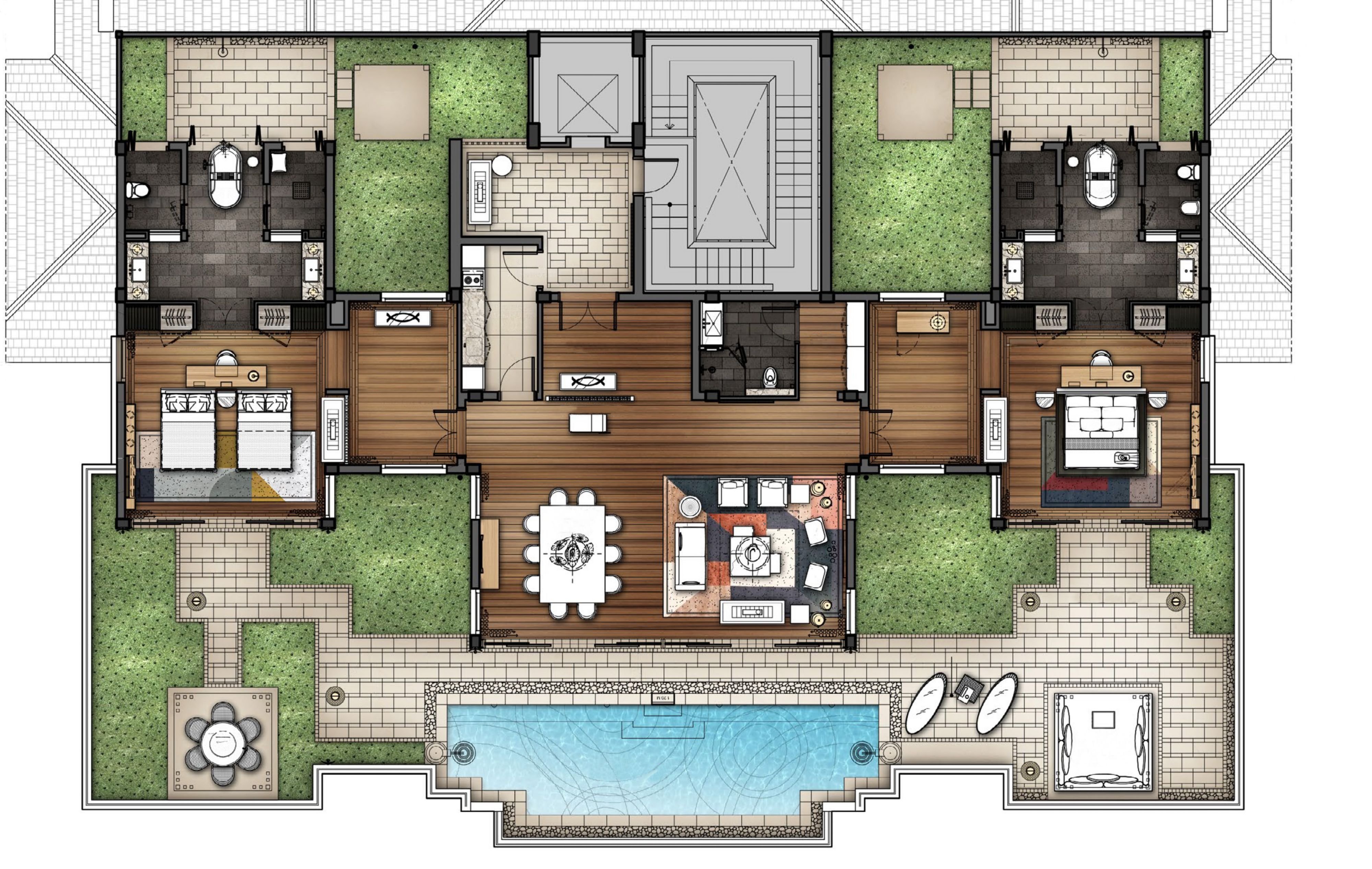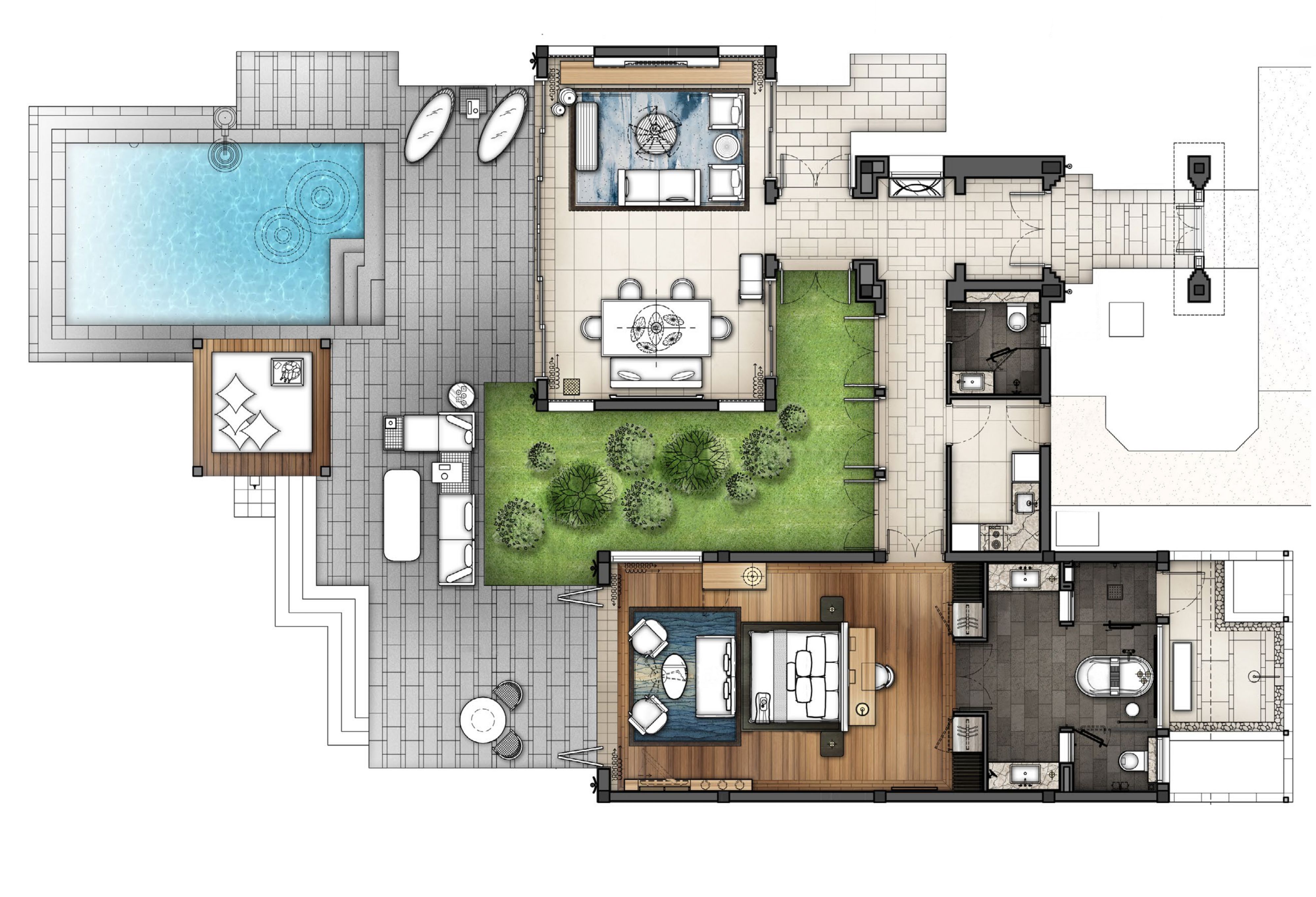 라스는 20㎡의 전용 수영장으로 연결되어 있어 섬의 황금빛 태양 아래에서 여유로운 시간을 보낼 수 있습니다. 친밀한 모임을 위한 전용 팬트리와 다이닝 룸이 마련되어 있어 편안한 휴식을 취하기에 이상적입니다. 빌라 투숙객은 빌라 내 체크인, 무제한 세탁, 빌라 내 또는 플로팅 조식, 리젠트 클럽 전용 이용 혜택을 누릴 수 있습니다.
