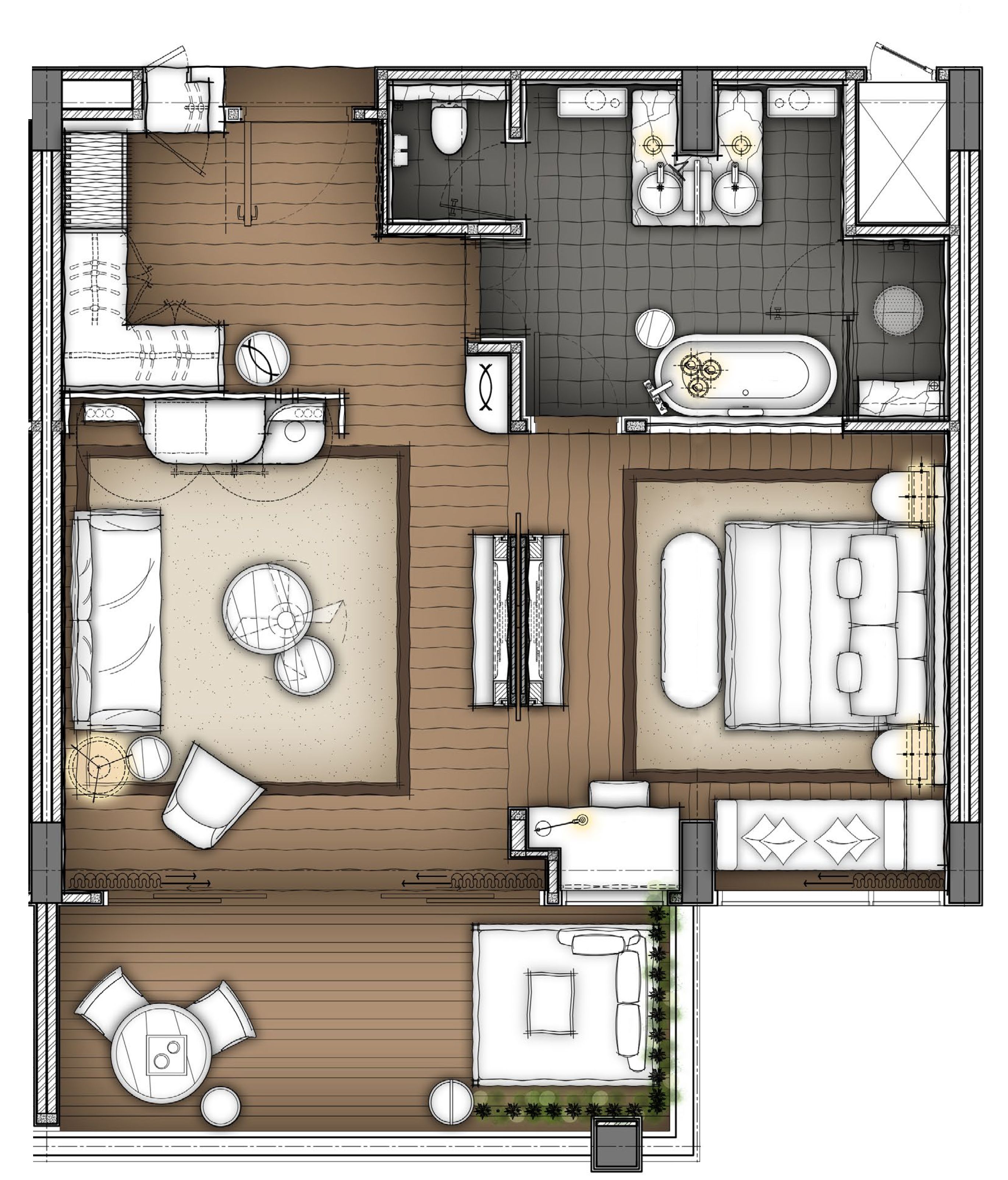 편안함과 우아함을 추구하는 가족을 위해 설계된, 침실 2개인 스위트는 넓은 공간, 세련미, 세심한 편의시설이 조화를 이루고 있습니다. 고요한 마스터 침실은 킹 침대를 갖추고 있으며, 트윈 침대를 갖춘 두 번째 침실은 추가 손님이나 어린이를 위한 편안한 휴식처가 되어 줍니다. 별도의 거실은 휴식을 취할 수 있는 매력적인 공간으로 발코니에서 푸른 자연을 만끽할 수 있으며, 라군 액세스의 확장된 테라스는 청록색 바다로 이어집니다.