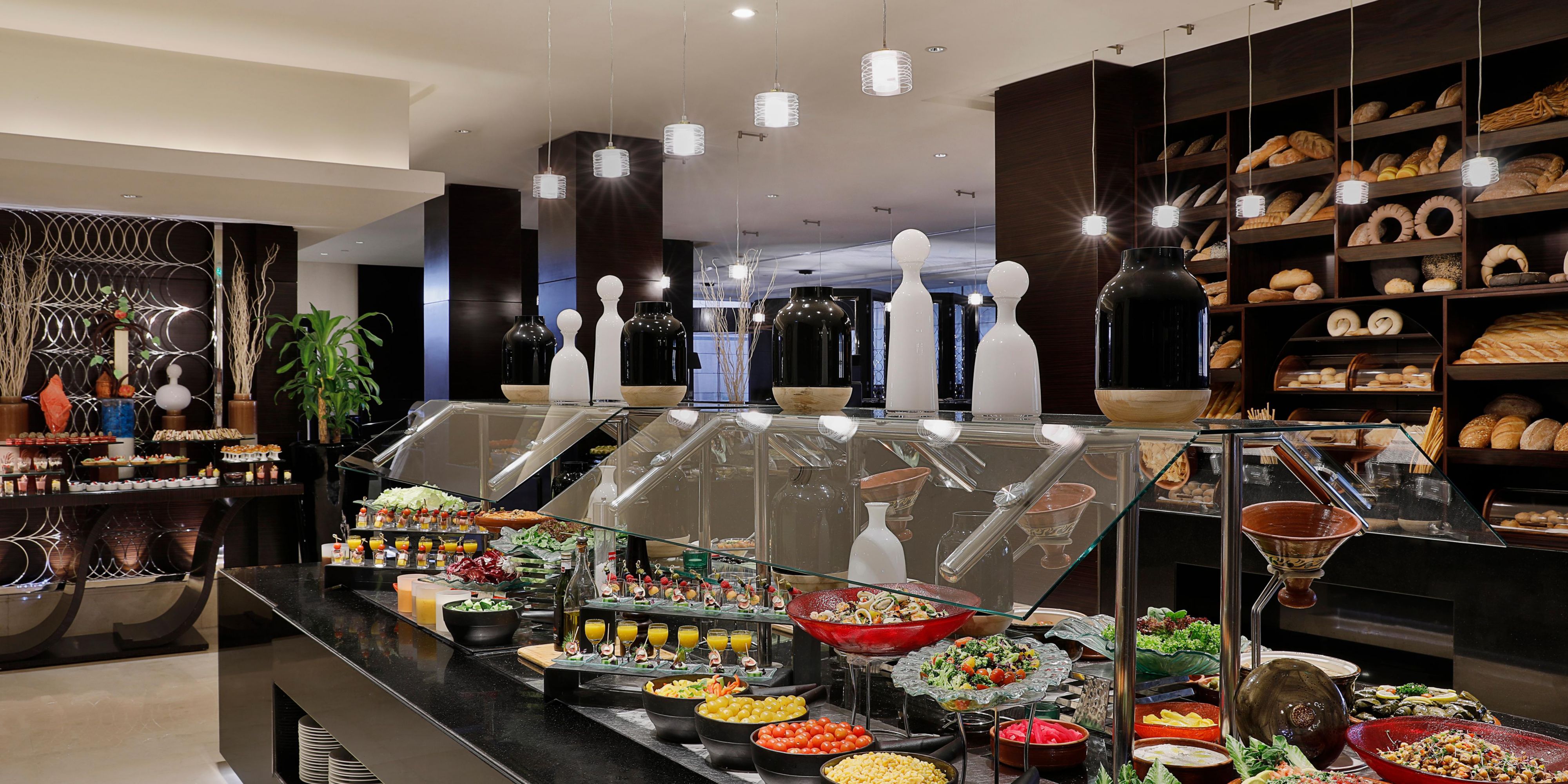 "ابدأ يومك في مطعم هورايزون، مع وجبات الإفطار من الفواكه الطازجة إلى الفطائر والمعجنات، بالإضافة إلى الأطباق الساخنة من محطات الطهي الحية. يقدم بوفيهنا العالمي الشامل أطباقًا شهيرة مثل السباغيتي بولونيز الدافئ والدجاج البرياني ، بجانب الوجبات الخفيفة اللبنانية والسلطات الطازجة اللذيذة. تشمل الحلويات العربية لدينا المهلبية ومعجنات أم علي ، ونقدم الشاي المميز وقهوة الباريستا والموكتيلات بالفواكه طوال اليوم. في وقت متأخر من الصباح ، يقدم طهاتنا أطباق البوفيه من جميع أنحاء العالم. الوجبات الخفيف