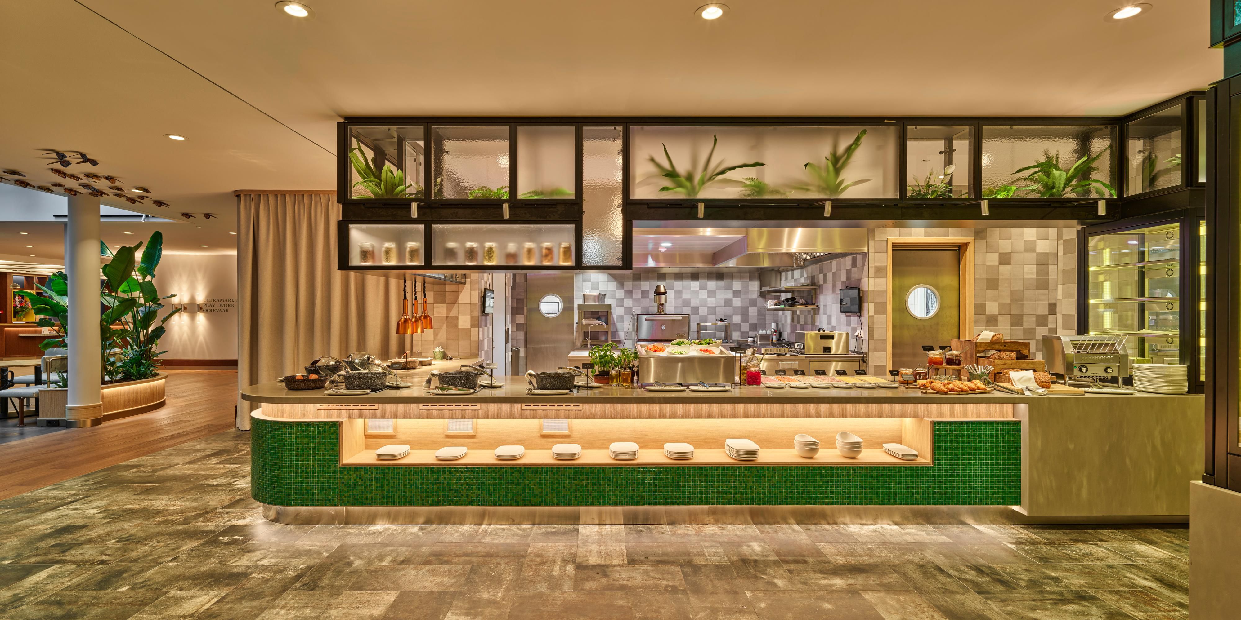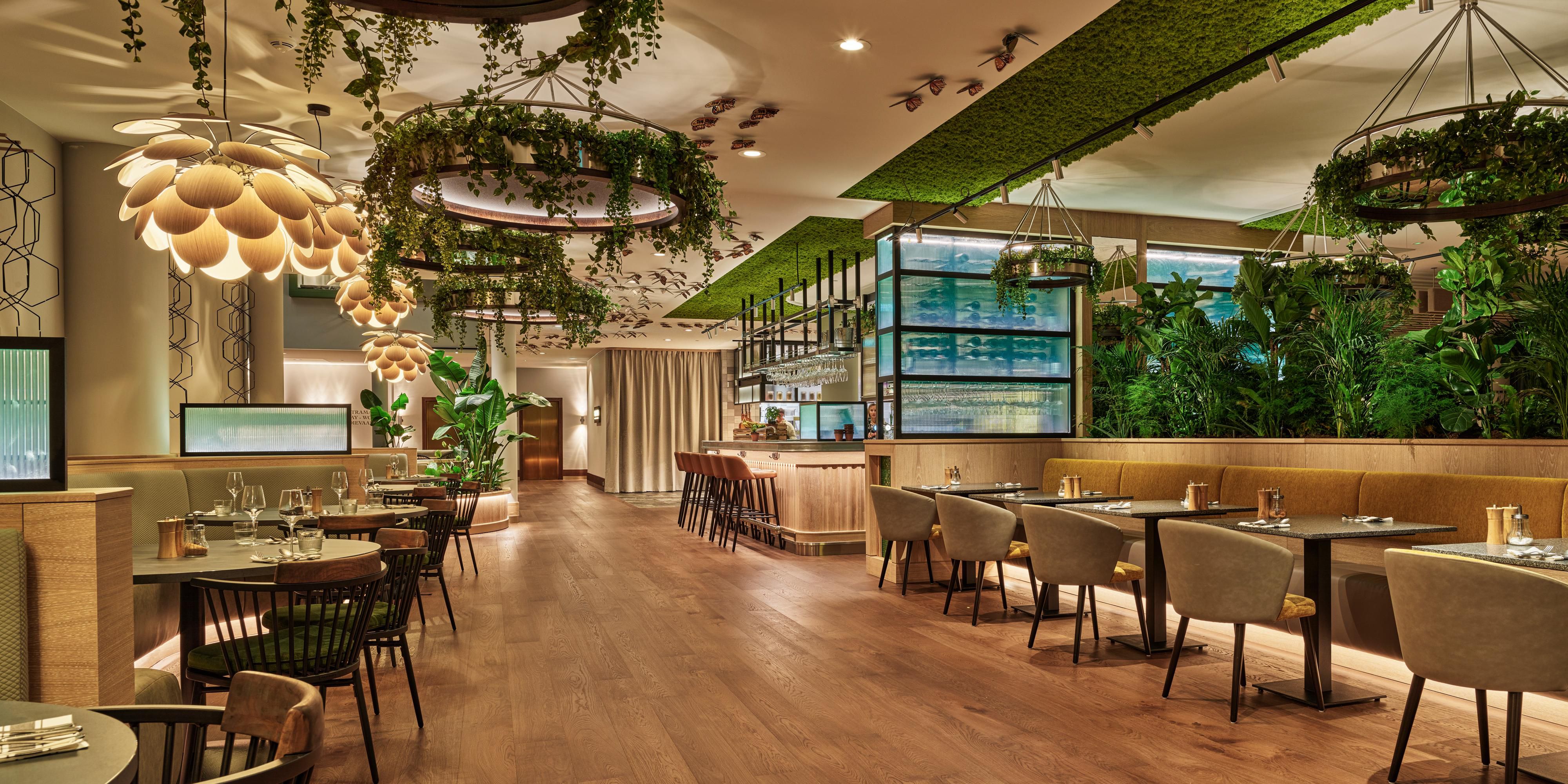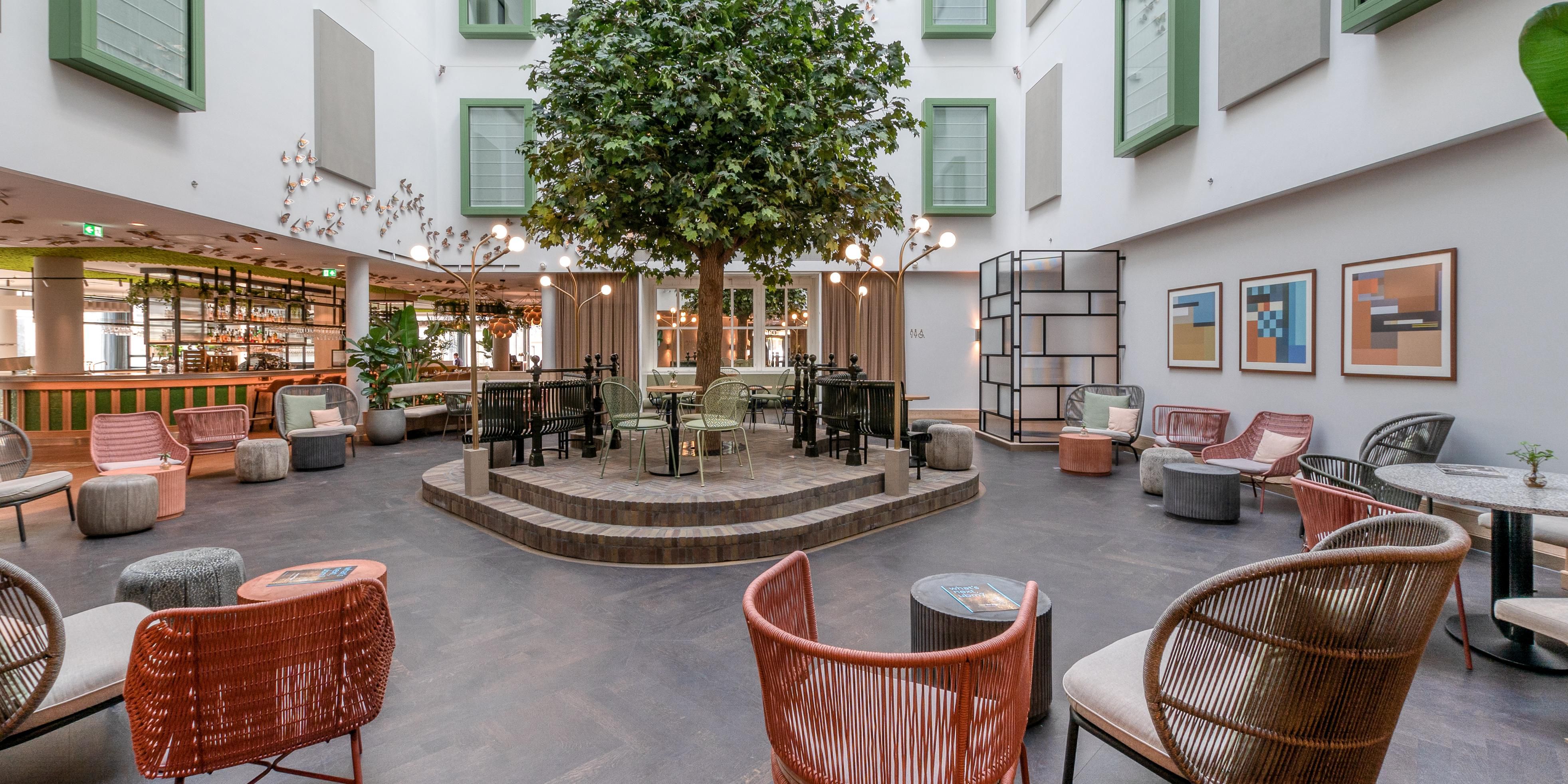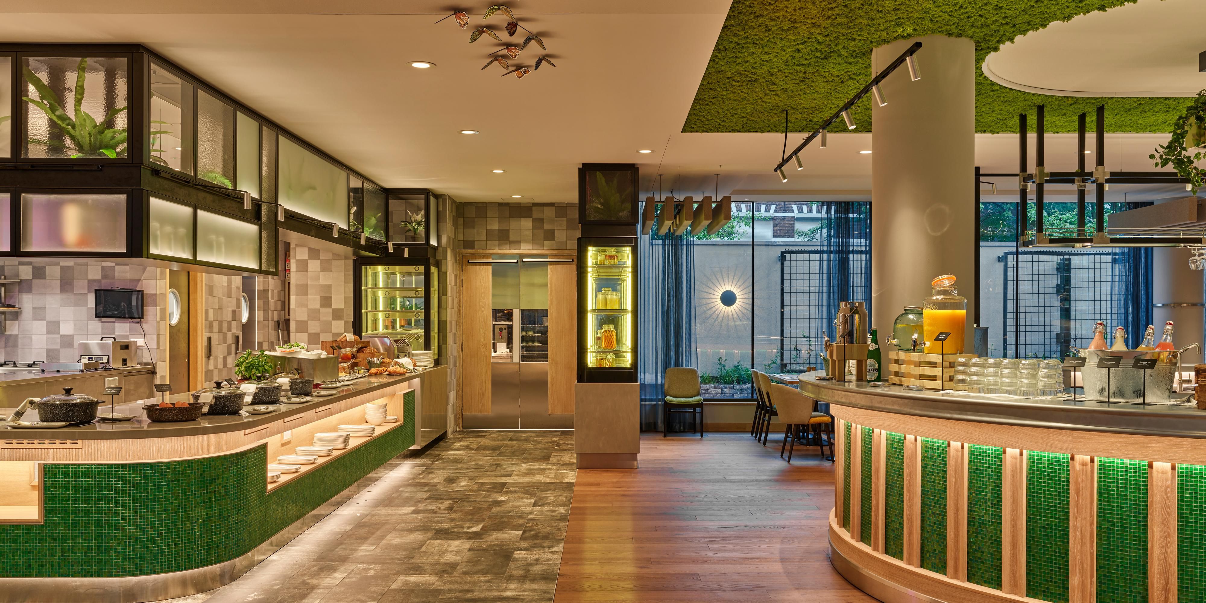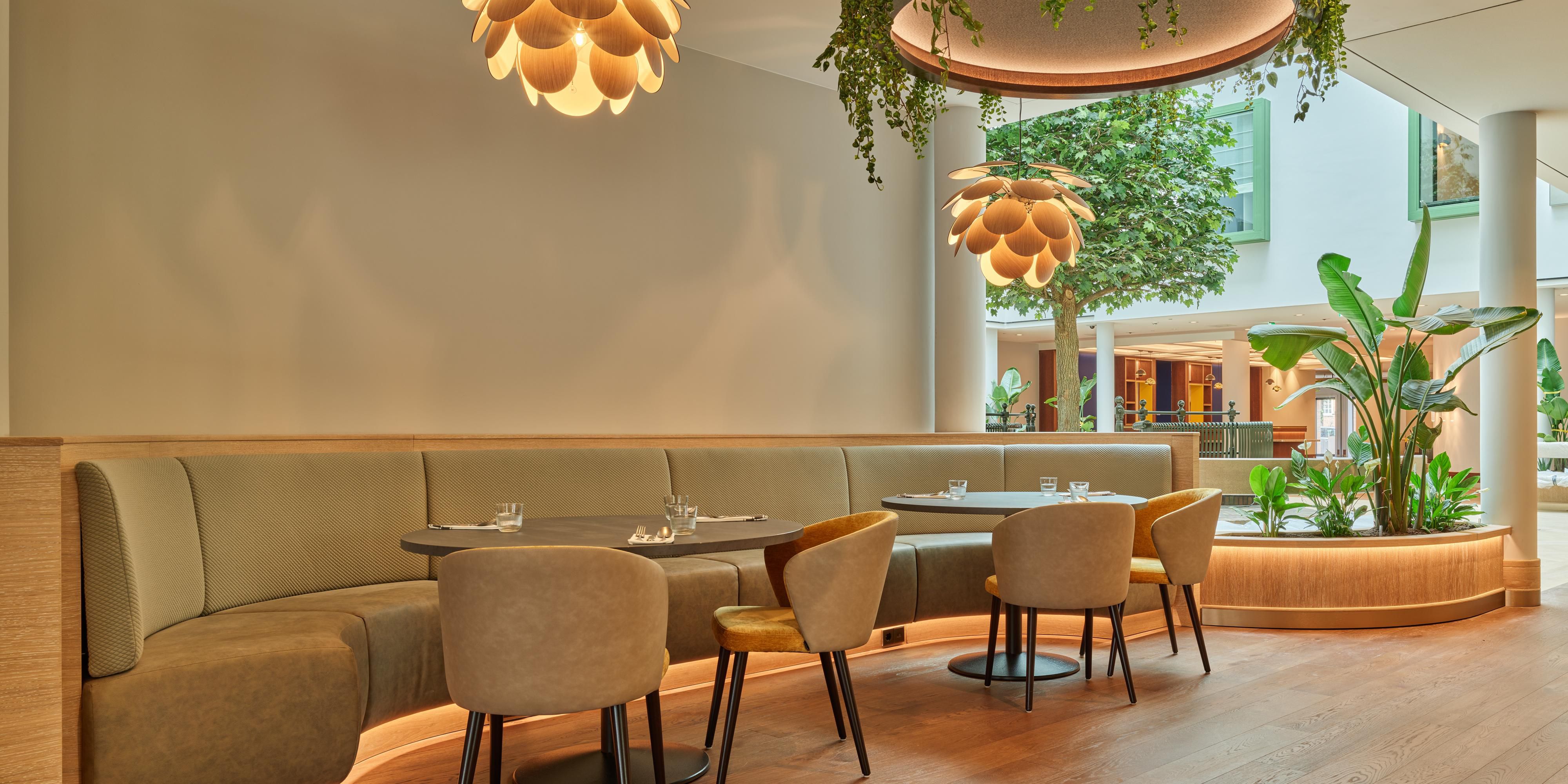No estilo de uma pitoresca praça europeia, nosso átrio oferece um espaço claro e arejado para relaxar e desfrutar de comida e bebida durante todo o dia. Com nossa impressionante exibição de borboletas em cerâmica que se estende até o teto de vidro no 6º andar, nosso restaurante no átrio traz o ar livre para o interior.