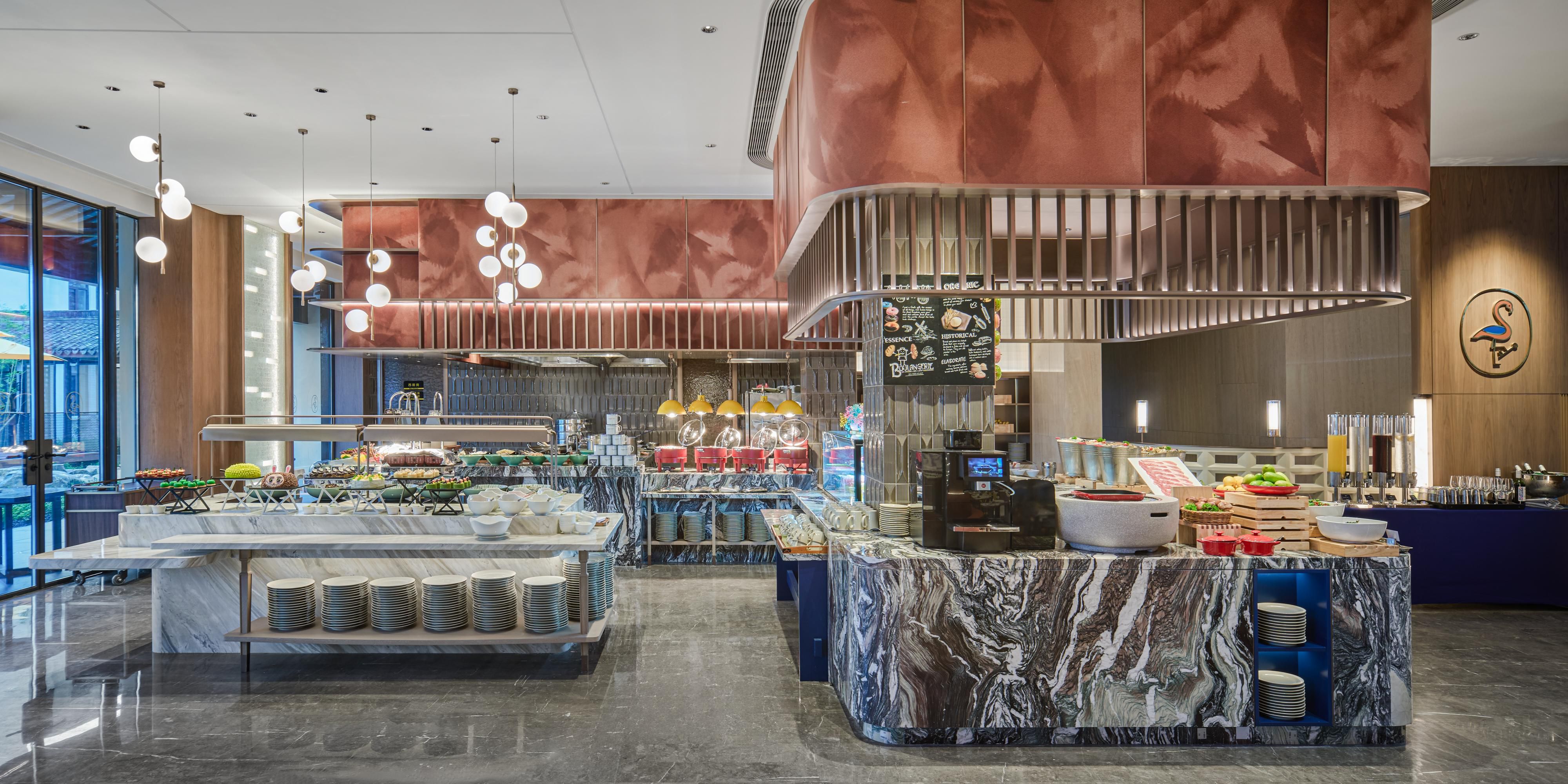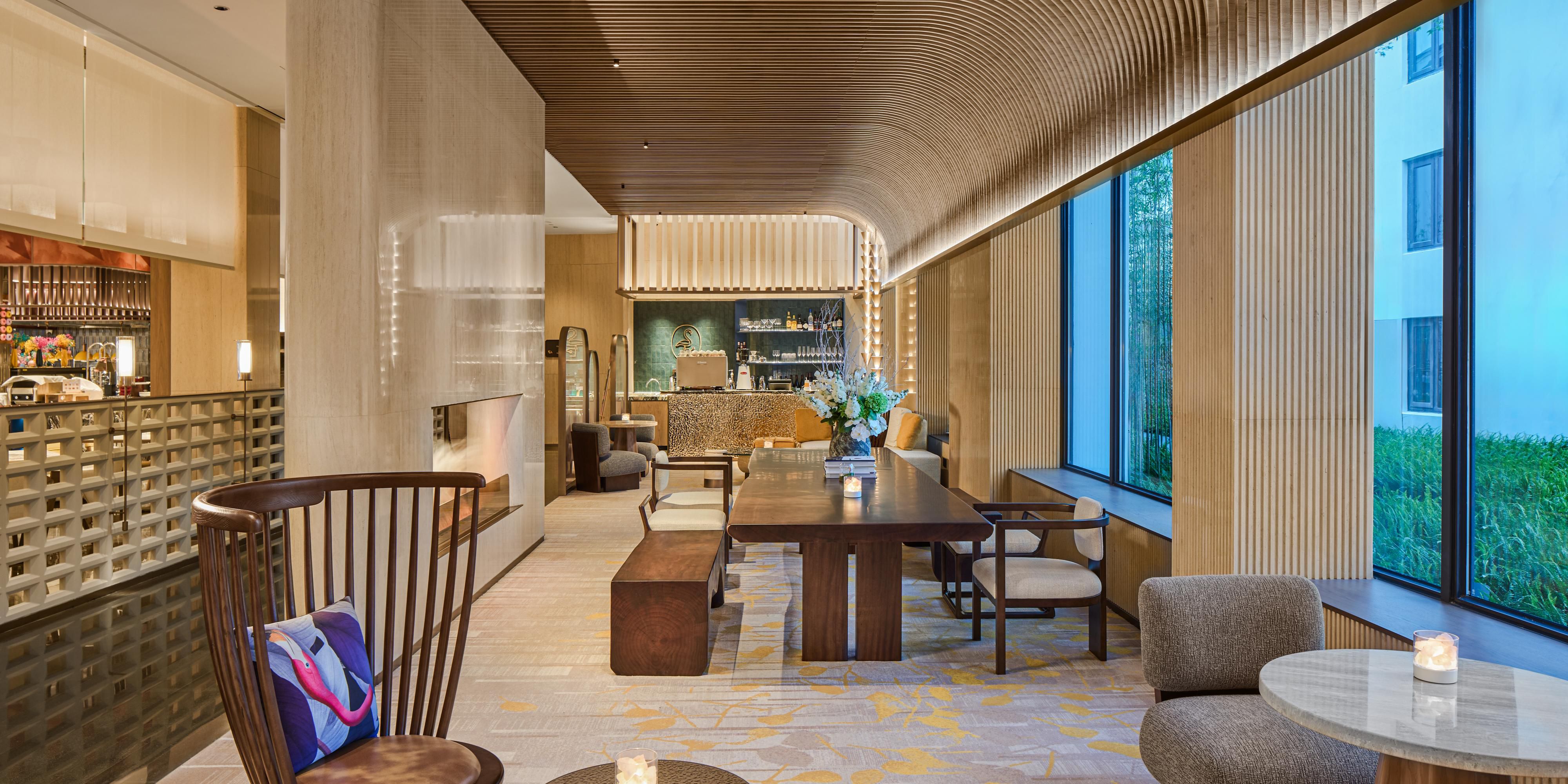 坐落于酒店一号楼首层的大堂吧,以28席雅致空间营造水乡内的休憩绿洲。现磨咖啡的醇香唤醒晨光,创意特调鸡尾酒点亮暮色,佐以精致简餐与主厨精选下午茶,让每个时刻都值得驻足品味。无论是商务小叙,还是午后闲情,这里永远是您放松身心的理想之选。