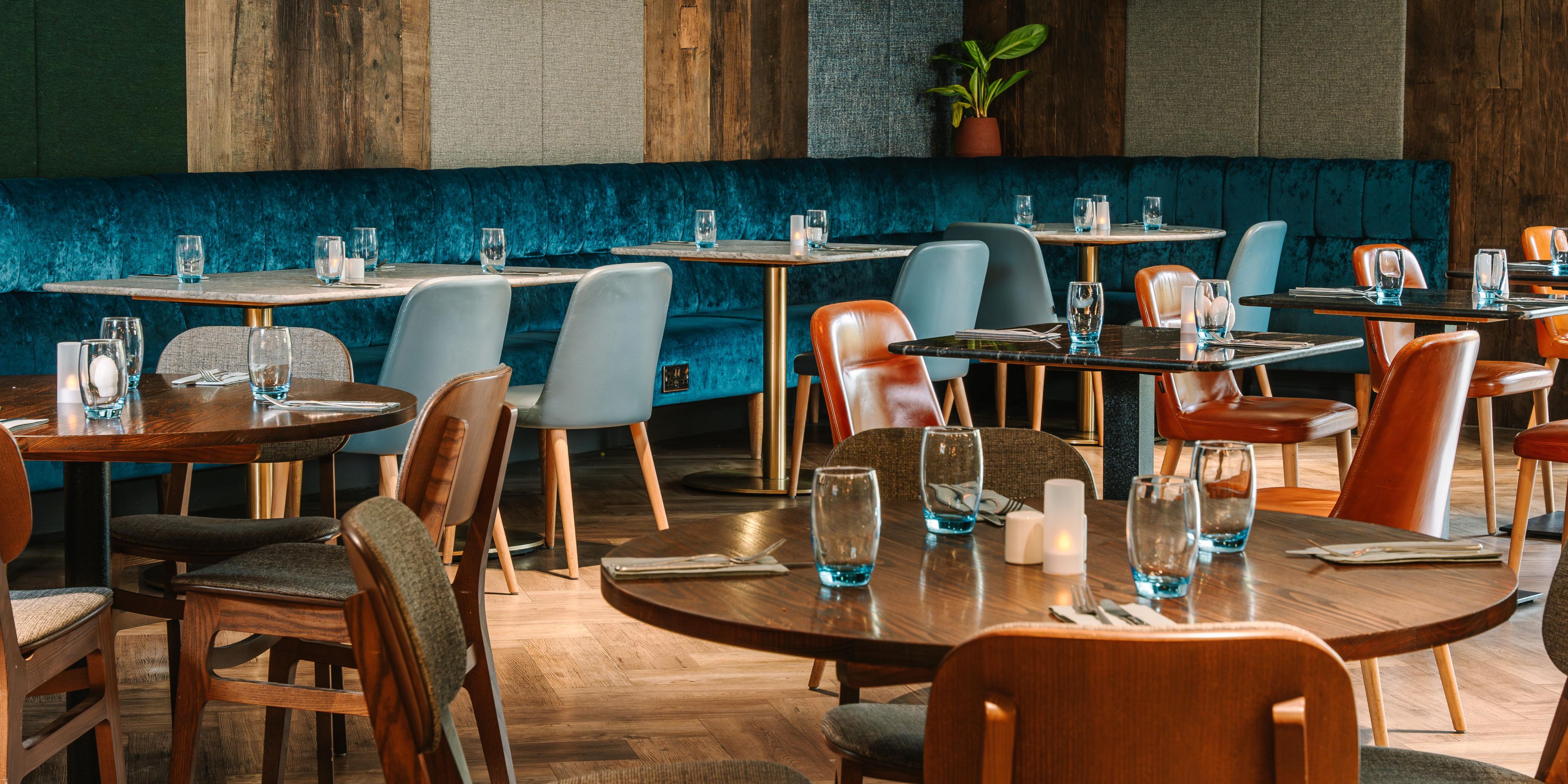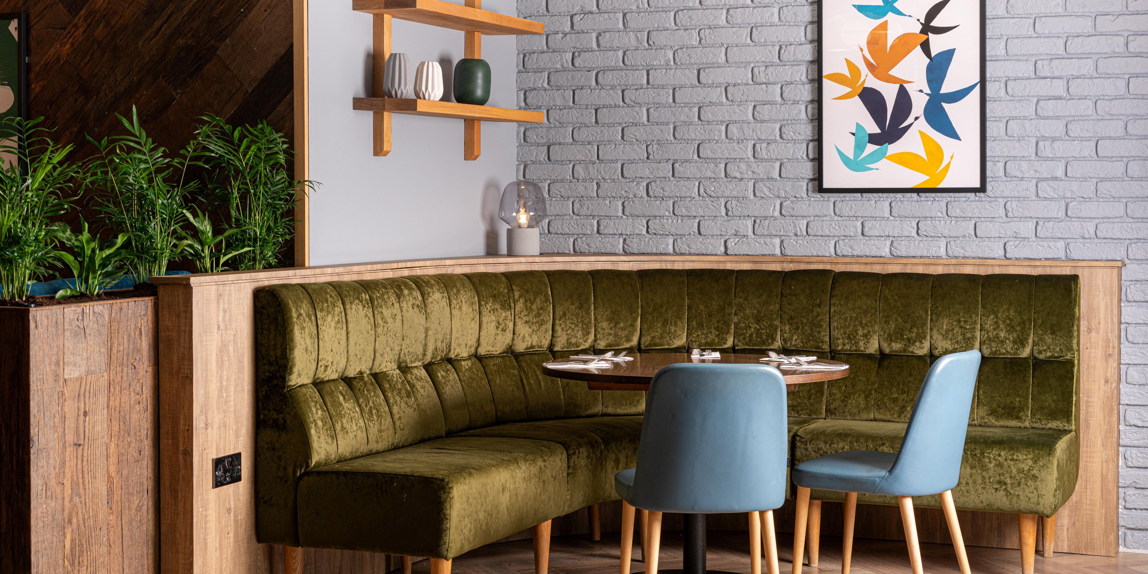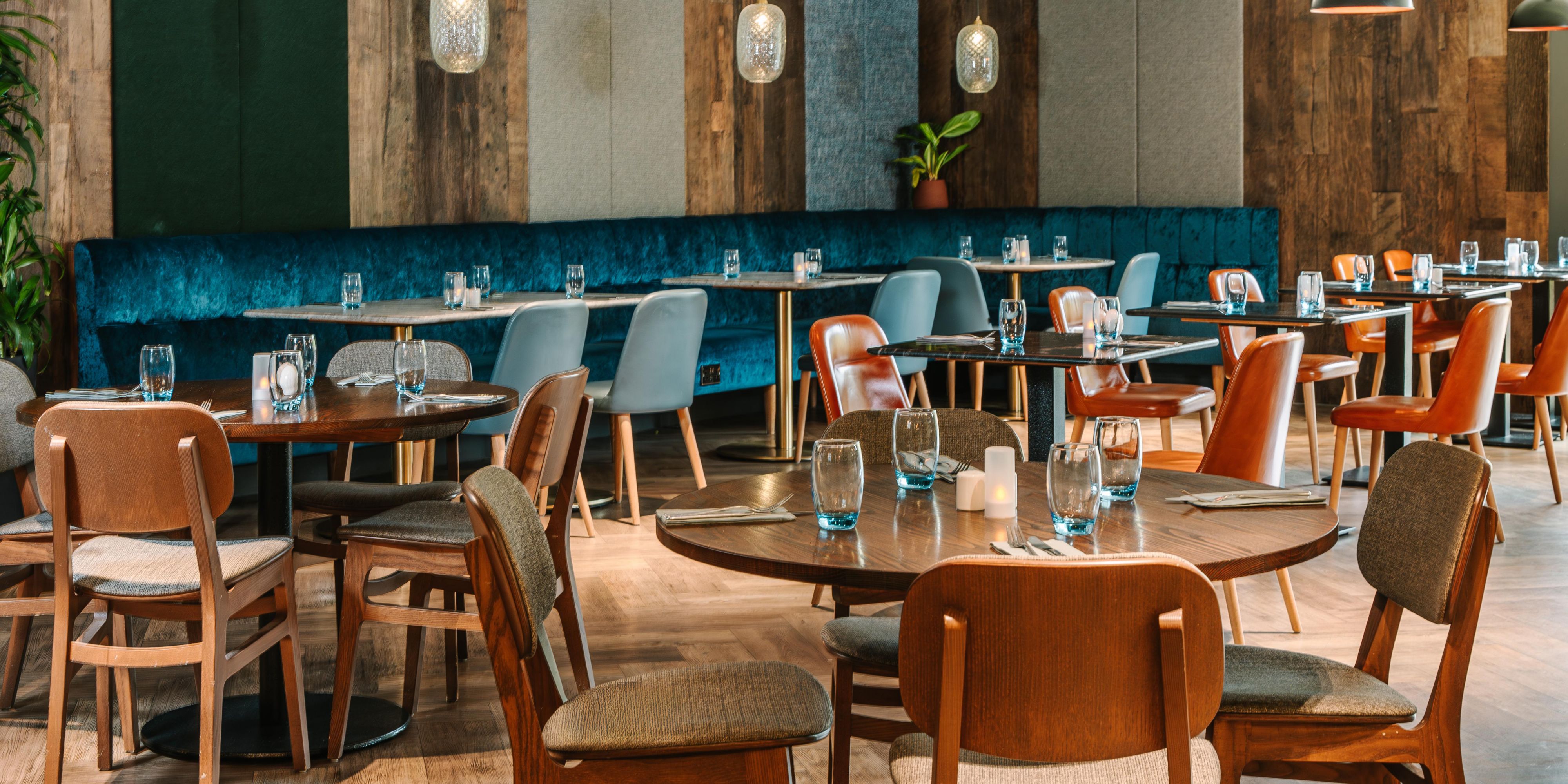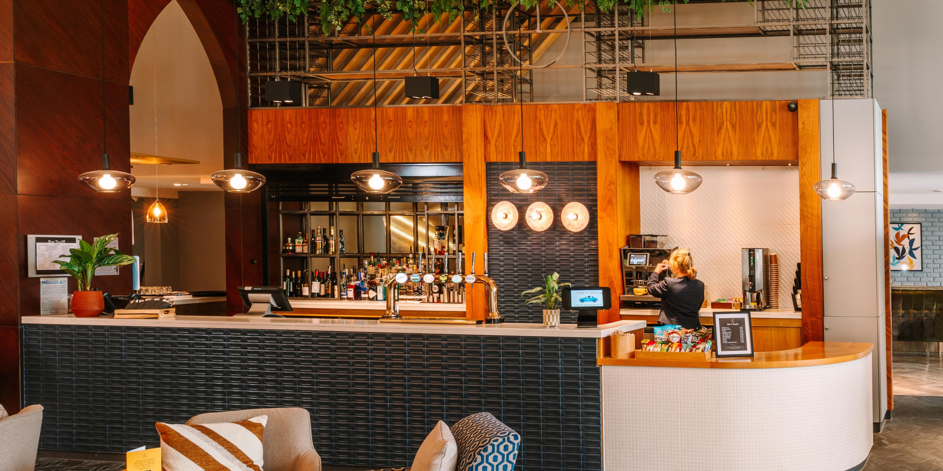 Open Lobby and Bar, with an array of seating options. Serving a selection of hot and cold food from the Bar menu , Breakfast option form 9am to 11am and full Bar Menu from 11am to 11pm. Residents and non residents are welcome to use the facilities. Desks, Booths and charging points are also available for use.