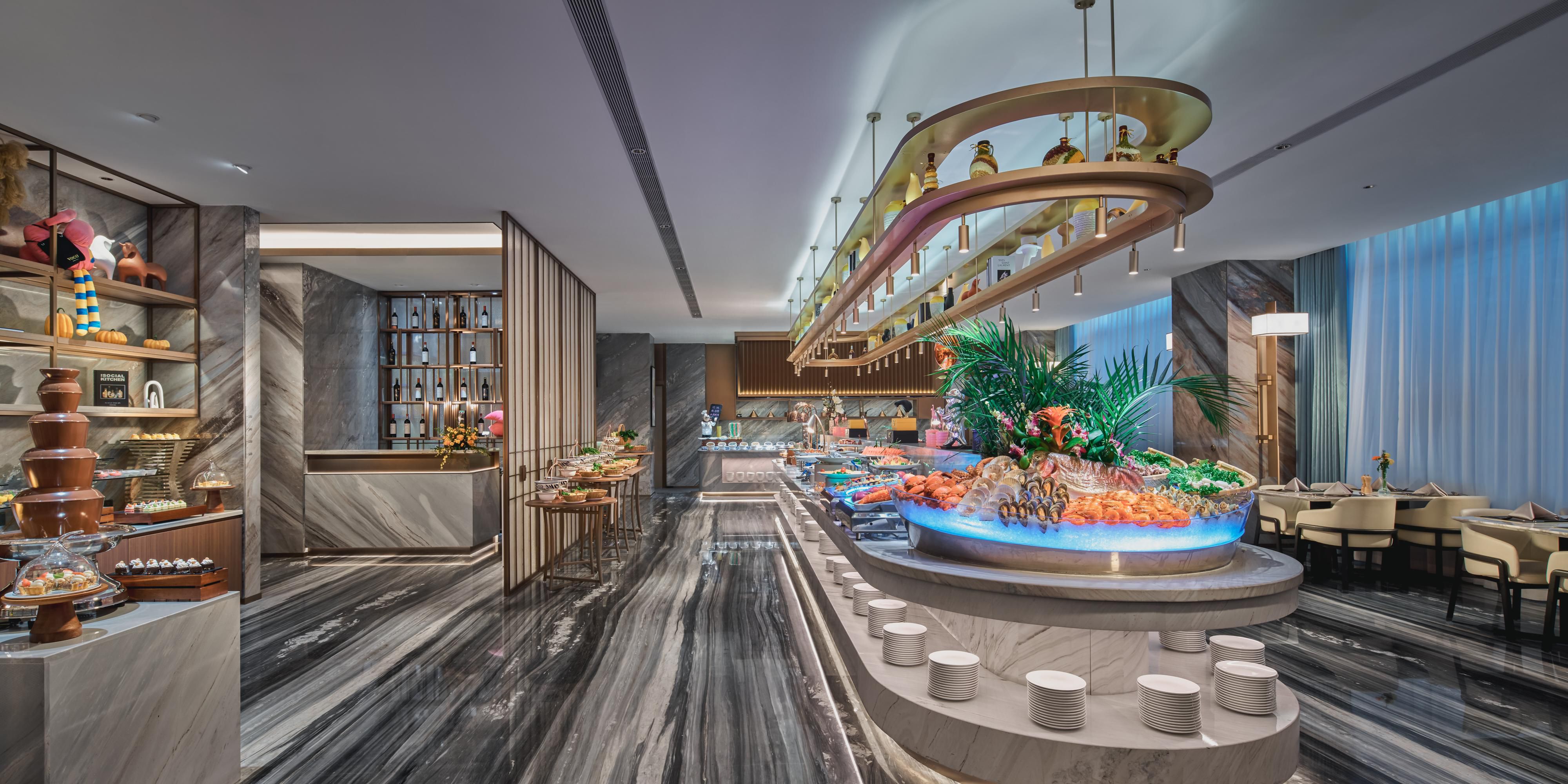 Restoran 80 kursi menyajikan prasmanan makanan laut dan hot pot khusus.