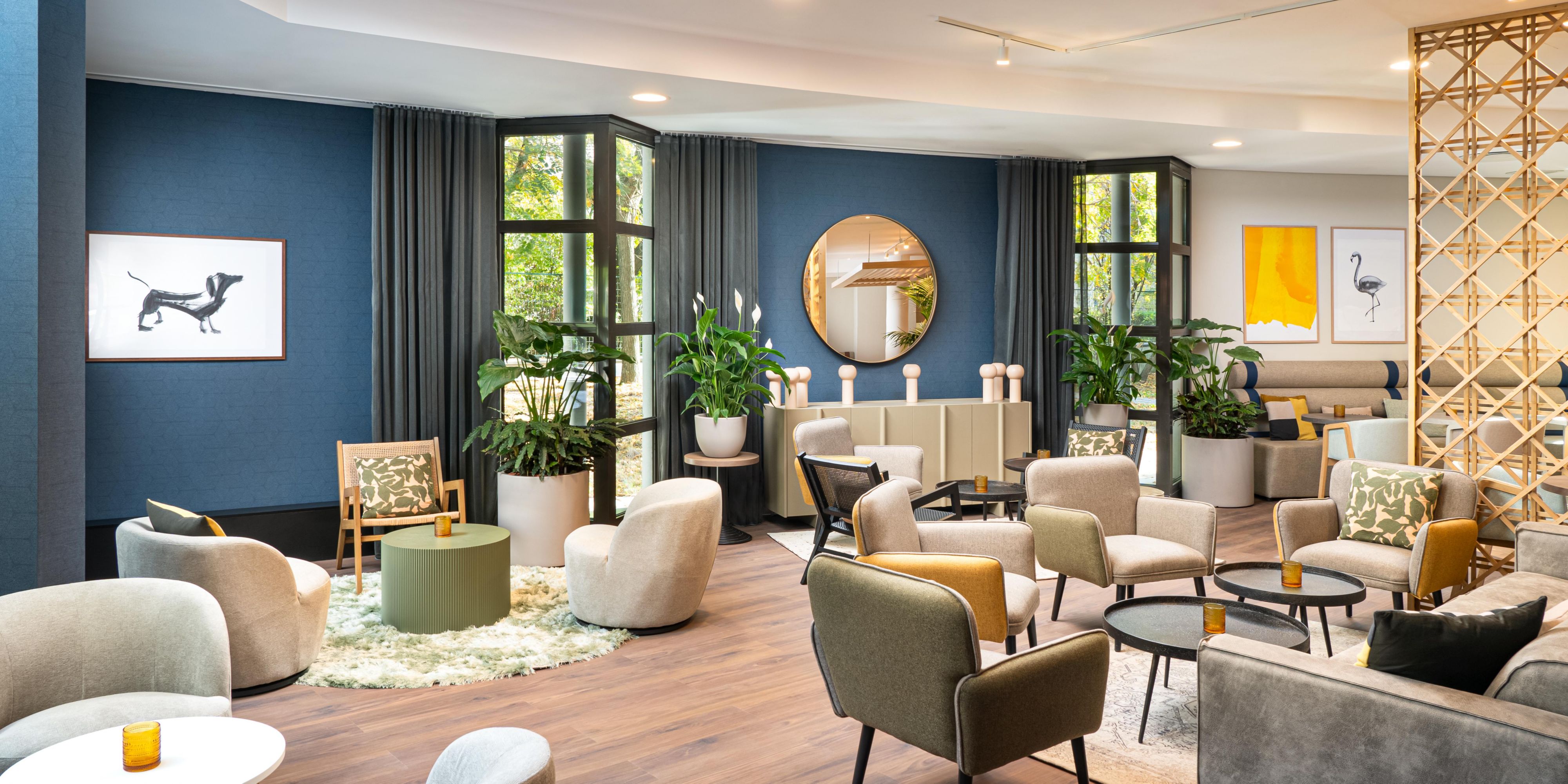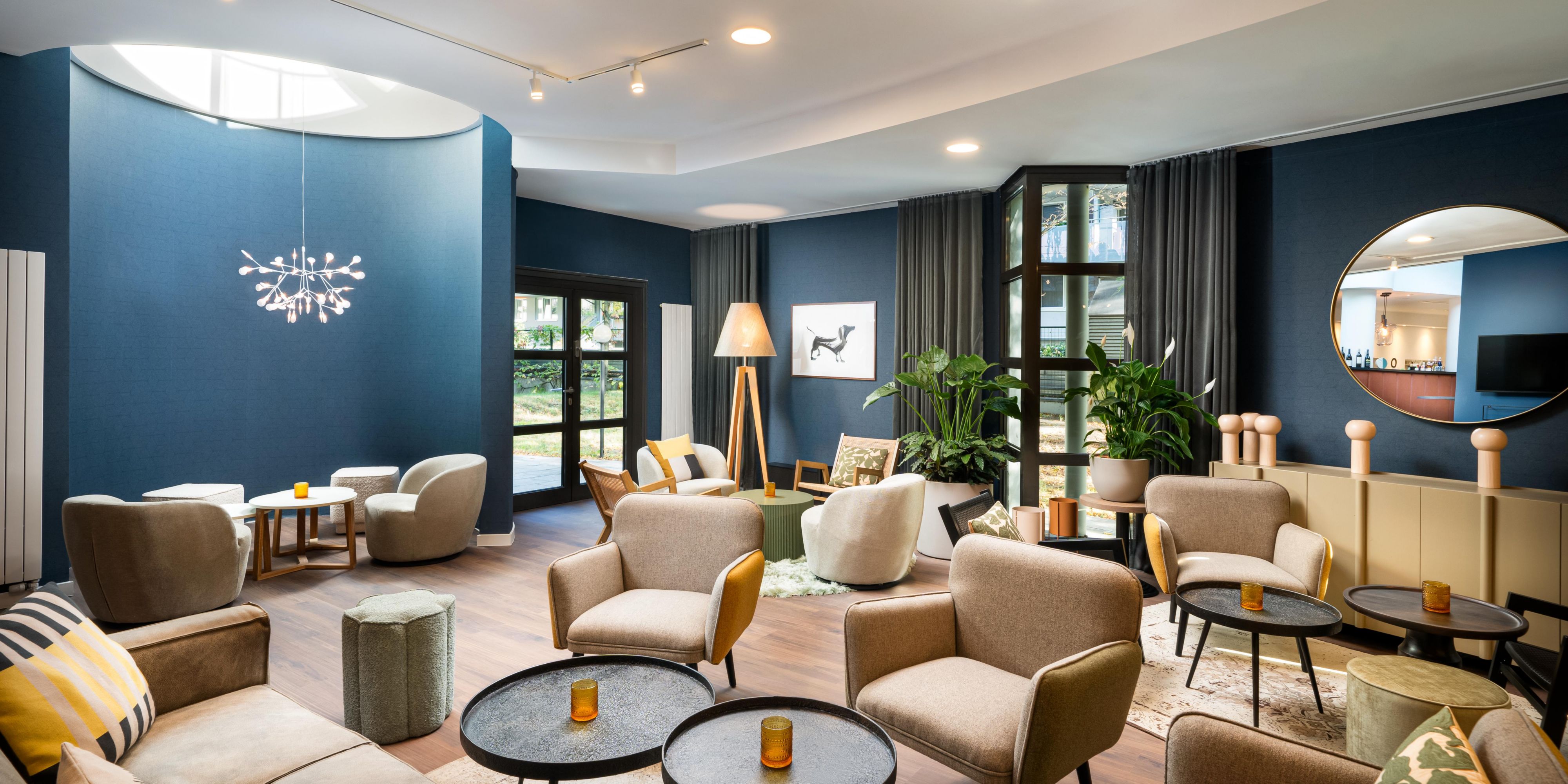 The lounge is literally only a few steps away from the reception and the restaurant away. With its beautiful dark timber flooring, the lounge creates a visual contrast to the lobby and restaurant, but it is directly connected to the bar through its similar design elements. The lounge is a timeless space for working and relaxing. The colours and the cosy seating generate a pleasant atmosphere, here, you can enjoy your first coffee in the morning as well as drinks and snacks in the evening.